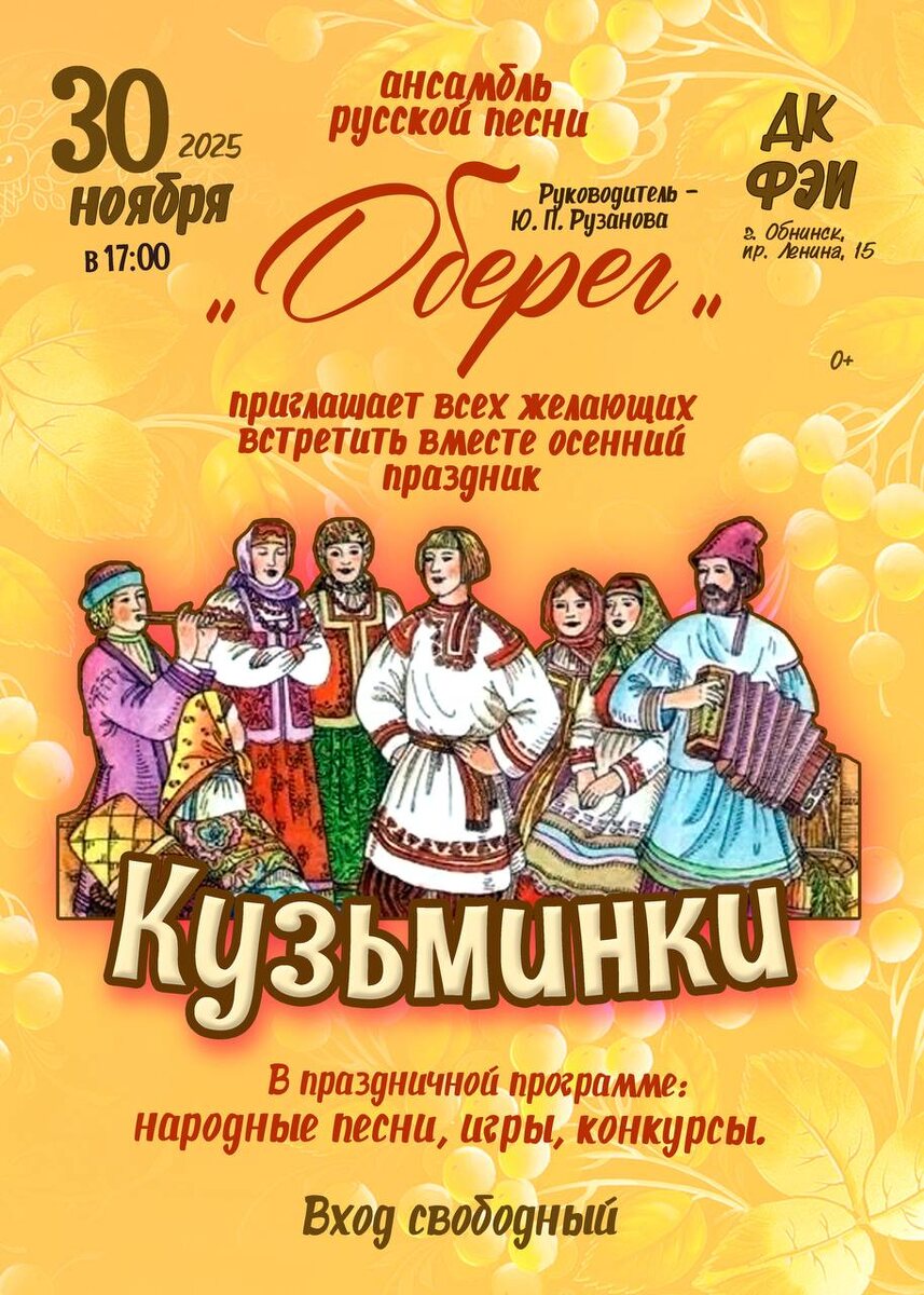 🎉30 ноября в 17:00 в МАУ «ДК ФЭИ» пройдёт осенний праздник «Кузьминки». Ансамбль русской песни «Оберег» подготовил для гостей замечательную программу, наполненную народными песнями, весёлыми играми и увлекательными конкурсами. Вход свободный. Обнинск, пр-т Ленина, 15. 👍 Подписаться | Ваша реклама