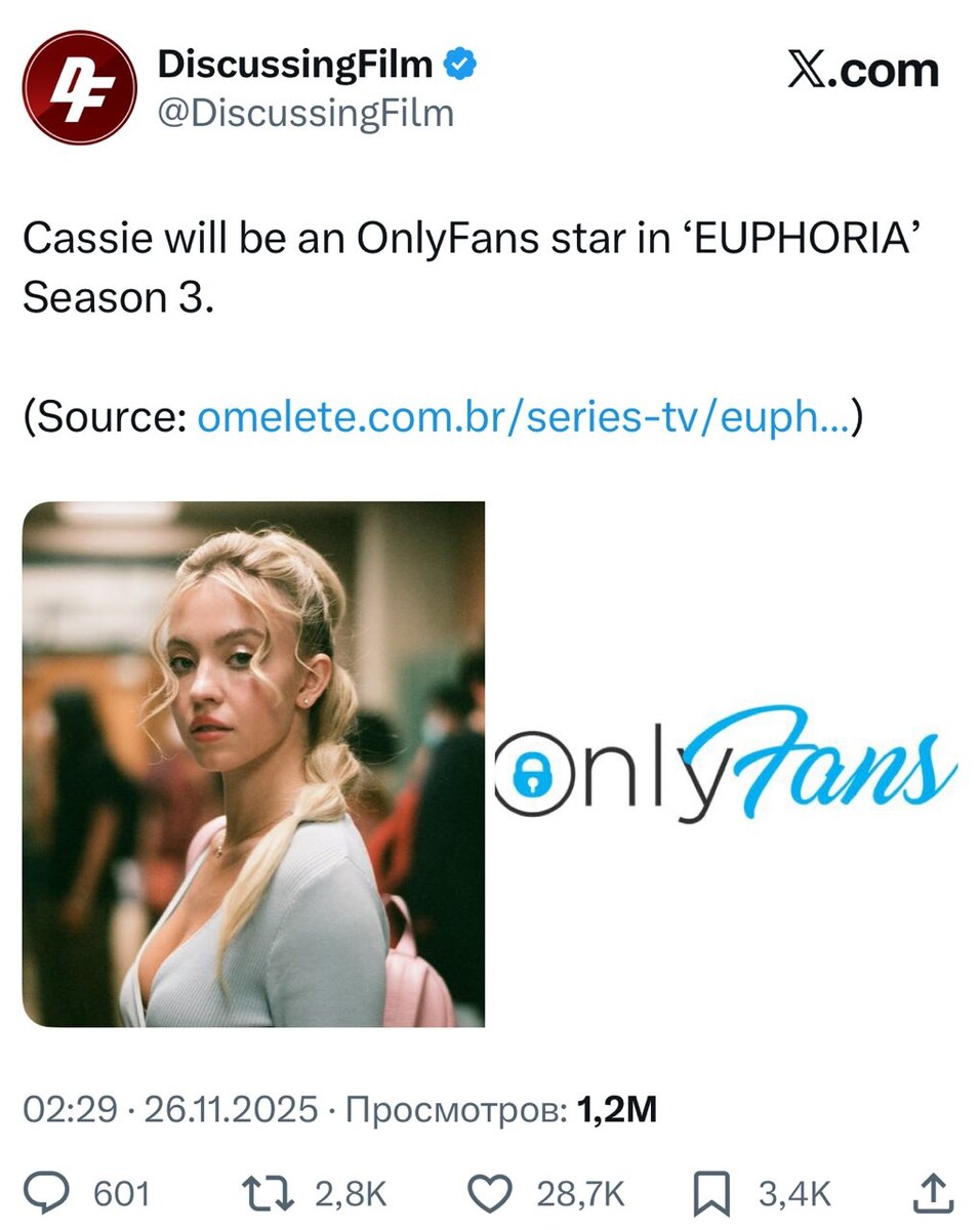 Сидни Суини станет онлифанщицей. Вернее, её героиня из «Эйфории» Кэсси. На пресс-конференции HBO в Бразилии показали тизер-трейлер нового сезона сериала. • Действие проходит через 5 лет после школьных событий сериала. • Ру всё ещё употребляет, её похищают наркоторговцы — за ней охотятся 2 группировки. • Кэсси и Нейт помолвлены. У Кэсси есть аккаунт OnlyFans, Нейт застаёт её за фотосессией в костюме кролика Playboy. Премьера весной 2026 года. Бесплатный GPT-bot ⚡️НейроМастер⚡️
