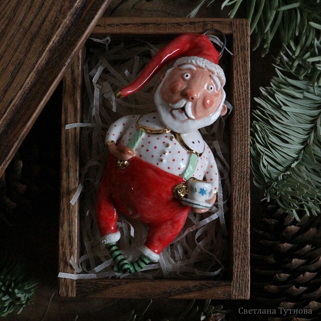 Ёлочная игрушка Санта-Клаус🍭 Ну что, вот он! Пузатый, домашний, в полосатых носочках с чаем и печеньем... Для красивого и уютного рождественского декора.✨ Написать мне Керамика, пигменты, глазури, золото. Ручная работа. Рост дедушки- 11.5 см, 9800р. #вналичии