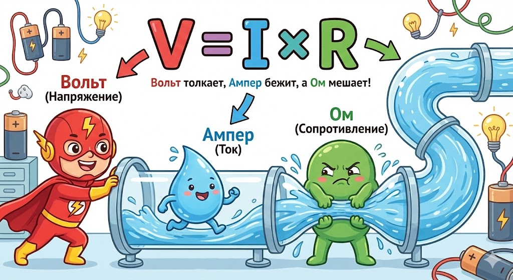 Привет, юные исследователи! Давайте разберемся, как работает электричество, с помощью этой веселой картинки. Это называется Закон Ома, и в нем участвуют три главных героя! Как они работают вместе? Запомните главное и очень простое правило, которое написано на картинке: Вольт толкает, Ампер бежит, а Ом мешает! Вот так весело работает самый важный закон электричества!