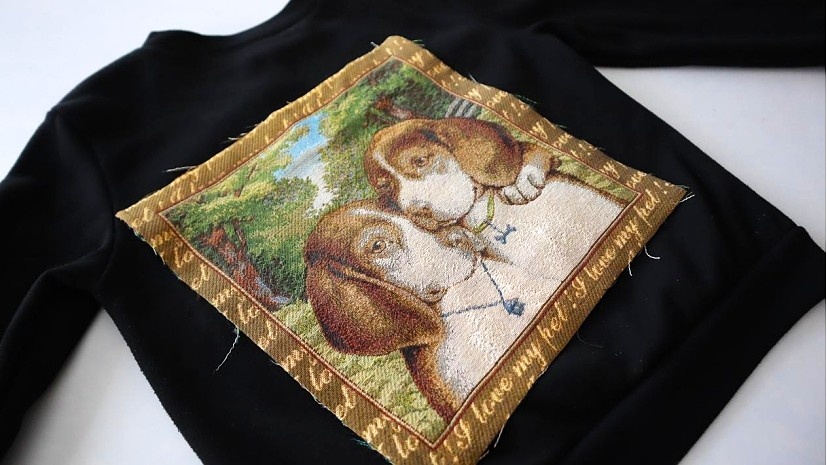 Почти любую вещь в гардеробе можно изменить, оживить и превратить во что-то уникальное. Многие так делают — добавляют наклейки, нашивки, кружево, бусины, пайетки, используют кусочки тканей и другие материалы. Стоит только немного пофантазировать, и привычная одежда меняется прямо на глазах, приобретая свежий стиль и настроение. Мне это особенно нравится: я не раз переделывала свои футболки, джинсы, сумки. И каждый раз вещь будто рождается заново. На этот раз решила обновить чёрную толстовку. У меня лежит гобеленовая наволочка, которой давно не пользуюсь. На ней очень милый рисунок: две дружные собачки, будто позирующие для семейного портрета. Собачкам пора засветиться на моей толстовке. Сначала вырезала рисунок по контуру, оставив по сантиметру припуска со всех сторон и обметала зигзагом. Затем приложила аппликацию на изнаночную сторону толстовки. Такой приём делает эффект более интересным: рисунок как будто «выглядывает» изнутри, создавая стильную рамку из основной ткани. После того