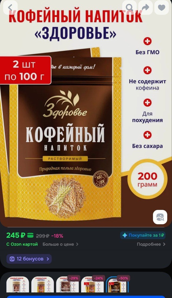 Кофейный напиток растворимый, Здоровье, злаковый кофе, порошкообразный, без сахара 2 х 100 г