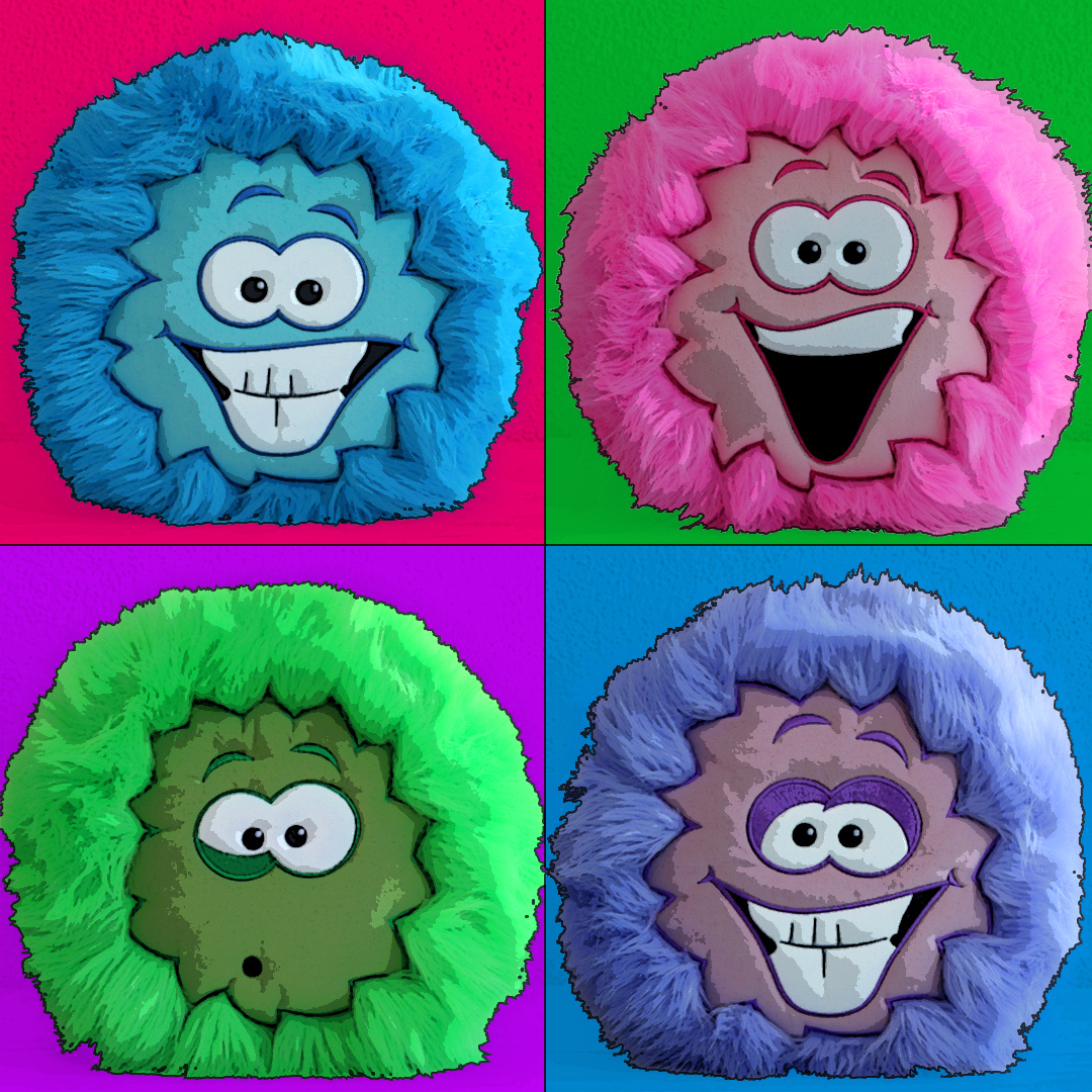 Как ни сложно было найти основную ткань, еще сложнее обстояло дело тканью для аппликации. Если для синего и розового меха повезло сразу найти нужный велюр, то фиолетовый был не совсем того оттенка как хотелось бы и зеленый - не зеленый, а скорее болотный. Поиск по всем известным мне магазинам мебельных тканей результатов не принес. Нужно было выбирать или четыре цвета, из которых не все идеально подходят нам, но зато они из одной коллекции и абсолютно одинаковы по фактуре и свойствам. Или искать, опираясь исключительно на цвет, не привязываясь к качеству ткани. Выбрали первый вариант, решив, что вышивальные нити визуально сгладят эту разницу и она будет не столь заметна. Да и, в конце концов, все это возможное цветовое несоответствие, в известной мере существует только лишь у нас в голове. Человек, который в первый раз в своей жизни увидит эти игрушки едва ли подумает о чем-либо подобном. Только если он не какой-нибудь художник, а у нас тут и так практически Энди Уорхол, так что…