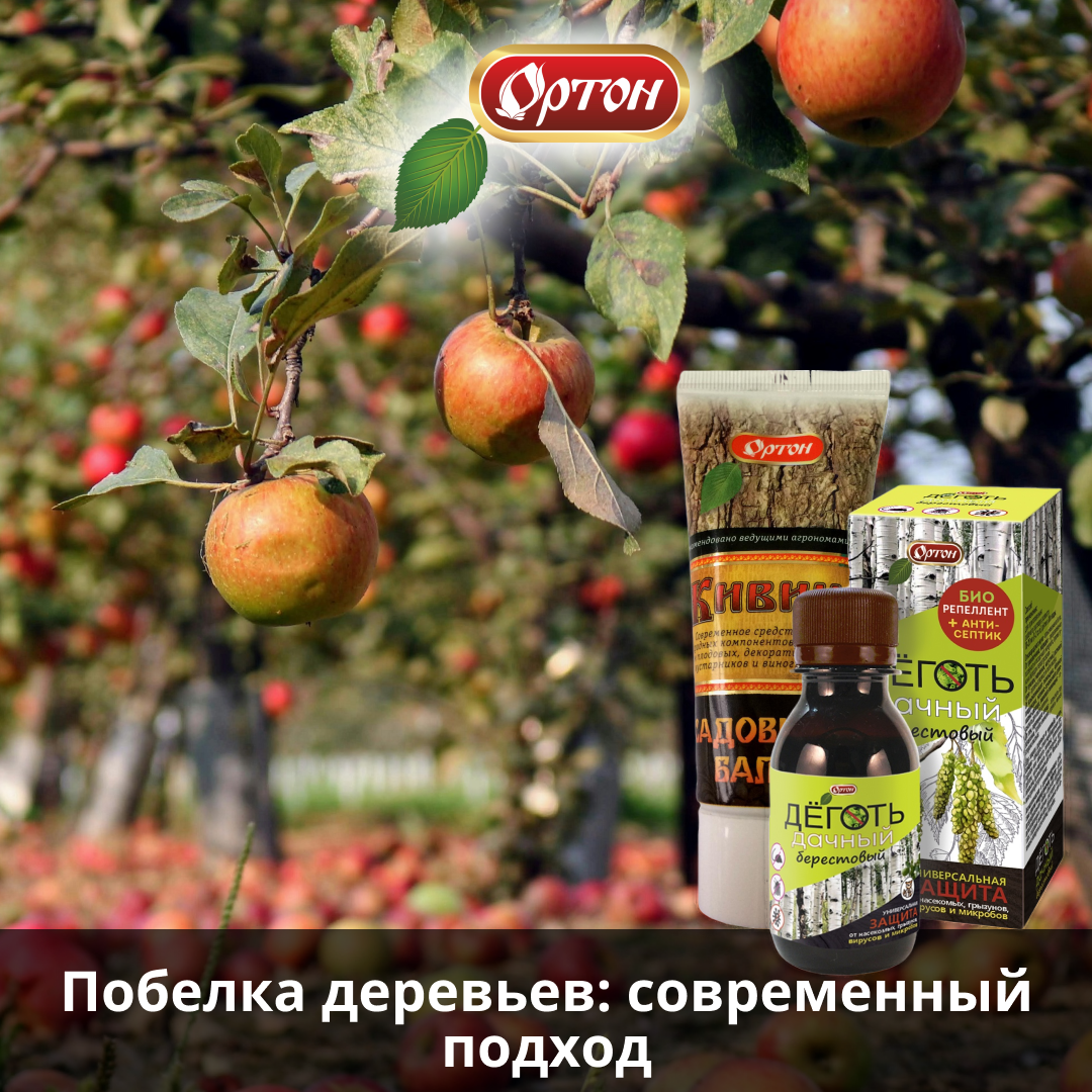 Побелка защищает деревья от суровых испытаний зимы и ранней весны. Рассказываем, как сделать побелку эффективнее с помощью современных знаний и препаратов. Зачем белить деревья осенью? Главный враг плодовых в холодное время года — морозобоины. Резкие перепады температур между днем и ночью вызывают растрескивание коры, что открывает дорогу для инфекций и вредителей. Побелка действует как солнцезащитный крем, отражая лучи и предотвращая перегрев коры. А еще она уничтожает личинки вредителей и споры грибов на поверхности коры. Современный подход. Для усиления эффекта к побелке добавляют: 1) клей ПВА — для лучшего прилипания и устойчивости покрытия к дождям; 2) карбофос — для борьбы с зимующими вредителями; 3) «Берестовый деготь» от компании «Ортон» — для усиления дезинфицирующего эффекта. Это мощное натуральное средство является репеллентом широкого спектра действия. Резкий, специфический запах надолго отпугивает зайцев, мышей и других грызунов. Одной обработки хватает на весь сезон. «Бер