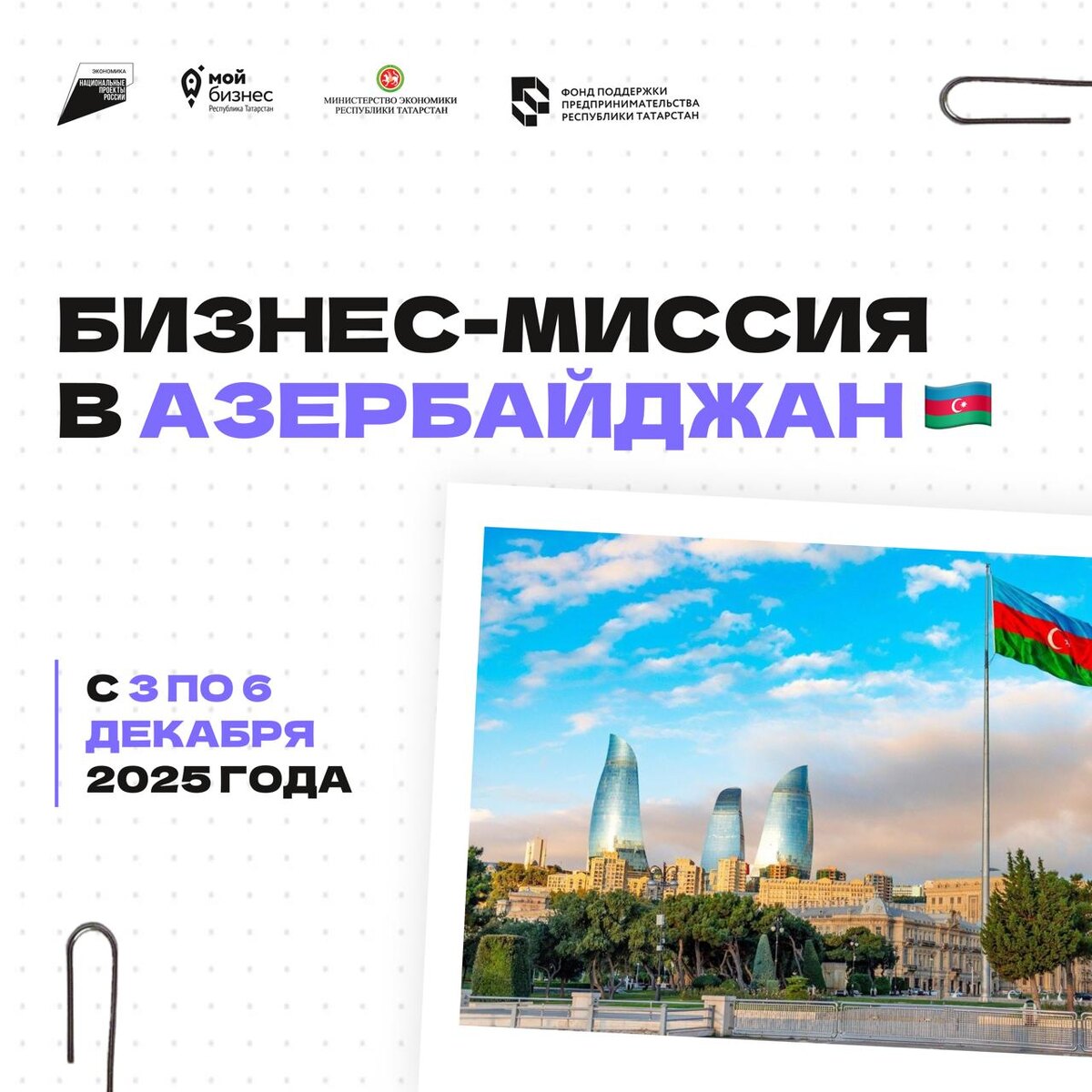 📎 С 3 по 6 декабря 2025 года состоится бизнес-миссия российских компаний в Азербайджанскую Республику (г. Сумгаит). Технополис «Химград» совместно с Министерством промышленности и торговли Республики Татарстан и Агентством по развитию экономических зон Азербайджанской Республики ведет работу по строительству промышленной зоны для локализации производств российских компаний на территории Сумгаитского промышленного парка. 📎 Делегацию Республики Татарстан возглавит заместитель Премьер-министра Республики Татарстан – министра промышленности и торговли Республики Татарстан О.В. Коробченко. 🎯 Целью визита является детальное ознакомление с условиями ведения бизнеса в Сумгаитском промышленном парке. За более подробной информацией обращаться к начальнику информационно-аналитического отдела АО «Химград» Боровковой Галине Алексеевне, тел.: + 7 960-039-29-36, borovkova@himgrad.ru 📎 Узнать о возможностях для экспортно-ориентированных предпринимателей можно в Центре поддержки экспорта НО МКК «Ф