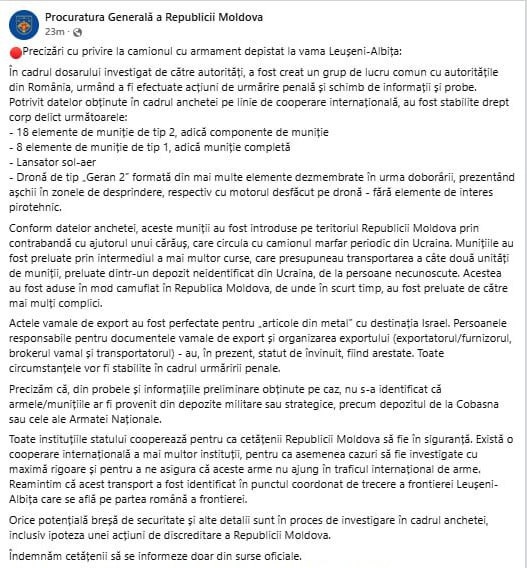 ⚡️🇲🇩Вот это поворот Генпрокуратура сообщила, что контрабандное оружие, найденное на молдо-румынской границе на таможенном посту Албица, было доставлено в Молдову из Украины. @eNewsmd.online 👈 Подписывайтесь на наш канал