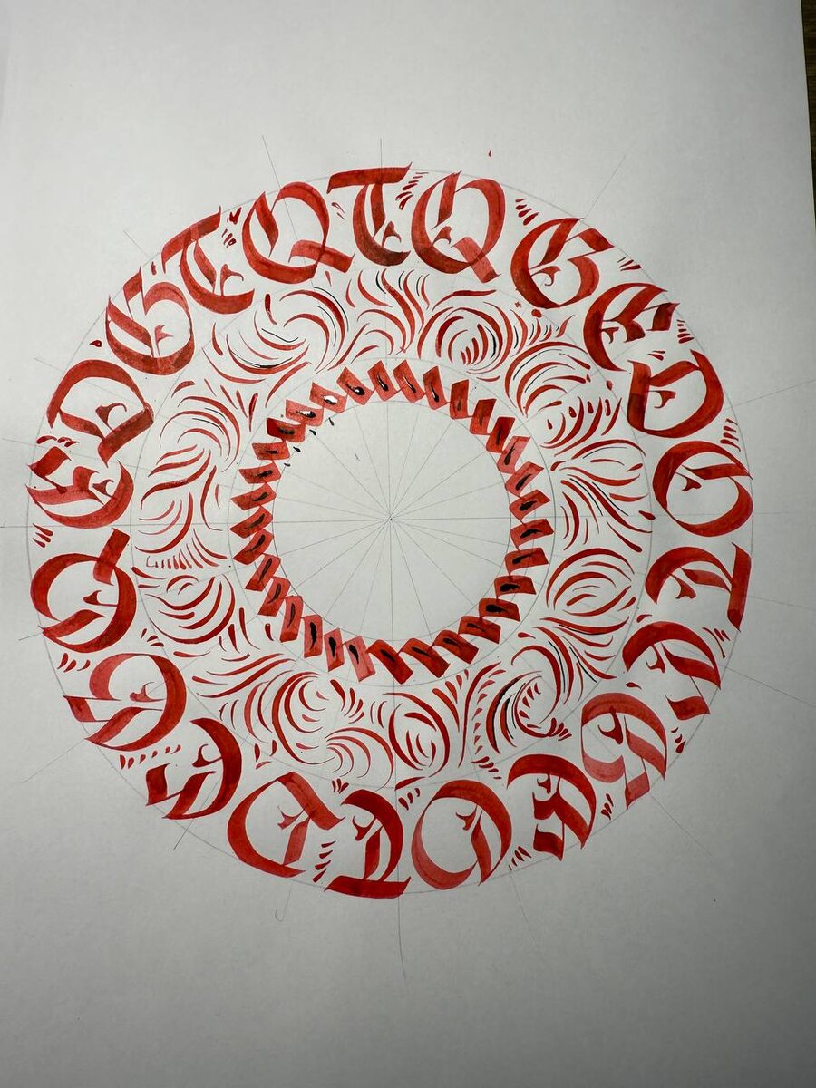 📝Ученица Анна Глева нашего курса по готической каллиграфии вдохновляет своей усердностью и трудолюбием. Особенно впечатляет круговая композиция, где готические буквы прекрасно сочетаются с тонкими, нежными штрихами, сделанными острым пером. Такой смелый контраст придаёт работам особую выразительность и глубину. Видно, что ученица вкладывает душу в каждый штрих и совершенствует мастерство шаг за шагом. Ее пример мотивирует не останавливаться💪 🔥Черная пятница! Осталось 4 дня до окончания самых выгодных цен: https://kaplanschool.ru/y/a2960a7