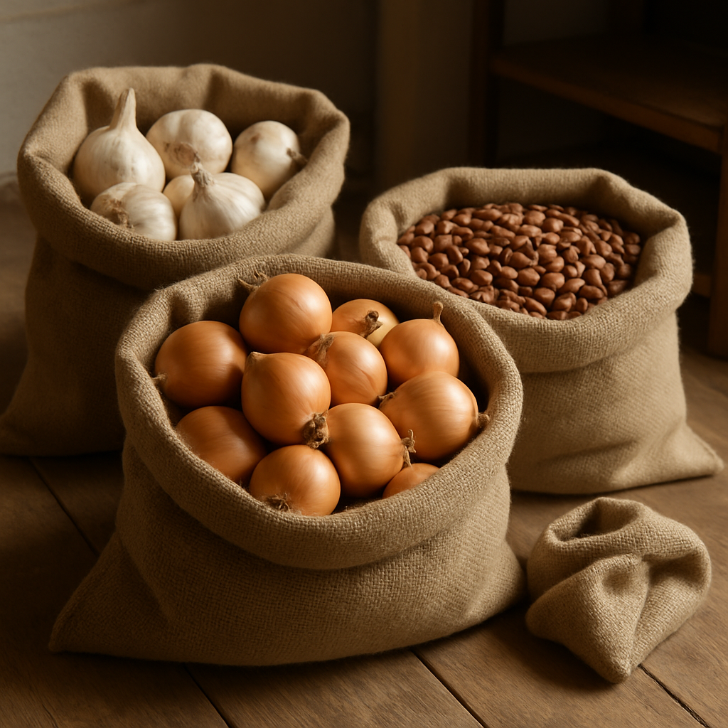 Но стоит один раз попробовать — и понимаешь, что некоторые овощи и корнеплоды именно в них хранятся лучше всего: не гниют, не мокнут, не «потеют», не собирают конденсат. Хочу поделиться своим опытом — что именно я храню в тканевых мешках и почему этот способ работает так хорошо. Секрет в том, что ткань: Это особенно важно зимой, когда погреб или кладовка может «гулять» по влажности и температуре. Лук в ткани хранится просто великолепно. Когда-то я держала его в коробках и сетках, но лук то подсыхал, то подмокал.