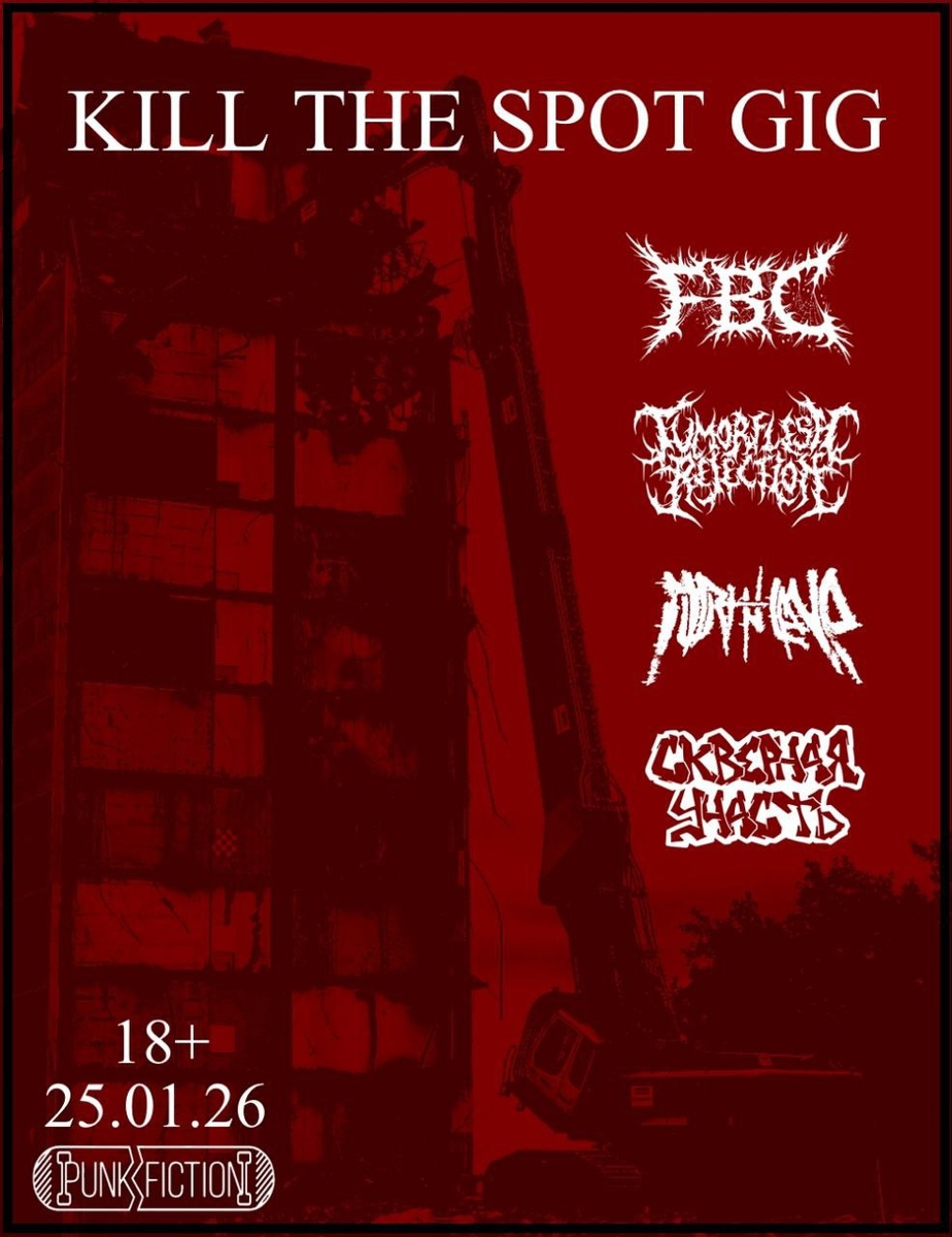 Москва ● Punk Fiction ● 25.01 (Вс) ● 18:00 #death #hardcore ► Kill The Spot Gig ● VK Сообщаем, что 25.01.26 в клубе PUNK FICTION будут проводиться плановые работы по уничтожению сцены и дестабилизации шейных позвонков. Участники: ► FBC ● VK ► TUMORFLESH REJECTION ● VK ► HURT IN LANE ● VK ► СКВЕРНАЯ УЧАСТЬ ● VK Билеты от 700₽