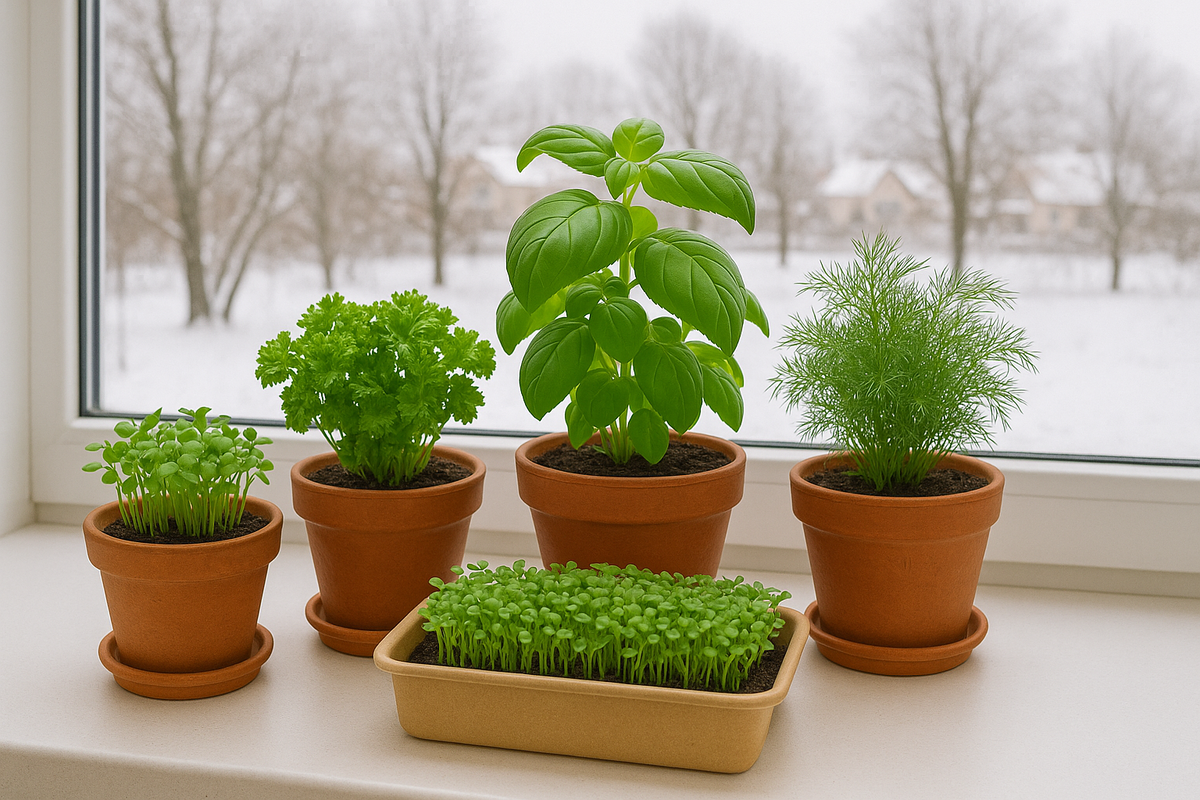 Когда за окном зима, а дачные грядки укрыты снегом, заядлым дачникам начинает не хватать свежей зелени и любимого хобби. Но это не повод скучать! Предлагаем превратить ваш подоконник в уютный небольшой огород. Это занятие не только подарит вам витамины к столу, но и станет прекрасной антистресс-терапией! Зелень и пряные травы для вашего мини-огорода Выращивать дома можно множество культур, но лучше всего для этого подходят скороспелые и неприхотливые виды зелени. Свет и тепло: главные условия успеха Зимой главный дефицит — это солнечный свет. Короткий световой день компенсируйте с помощью фитоламп или обычных светодиодных ламп белого света. Оптимально досвечивать растения утром и вечером, чтобы общий световой день составлял 12-14 часов. С температурой вам будет проще: большинству зеленных культур комфортно при +18...+22°C. Главное — беречь их от сквозняков и горячего воздуха батарей. Можно поставить горшки на подоконник и использовать увлажнитель воздуха или просто регулярно опрыскив