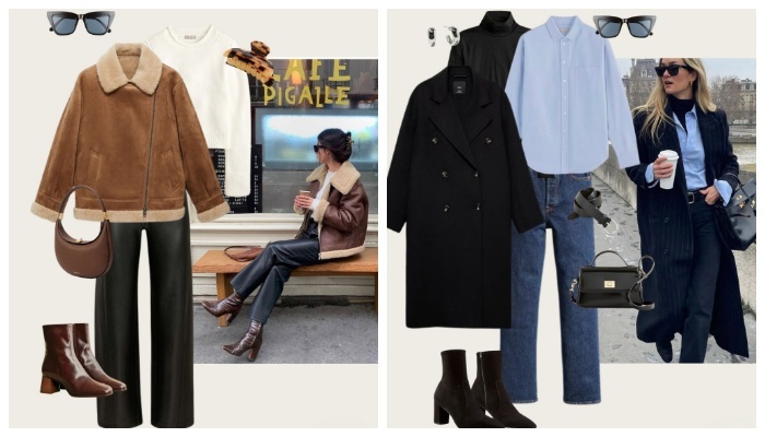 Настоящая зимняя классика по-французски: дублёнка оттенка тёплого капучино, широкие чёрные брюки и кожаные ботинки. Солнечные очки, минималистичная сумка и лёгкий белый джемпер добавляют светлости и мягкости. Такой образ идеален для зимних прогулок по городу — уютный, тёплый и благородный. Бордо и олива — тандем для зимы