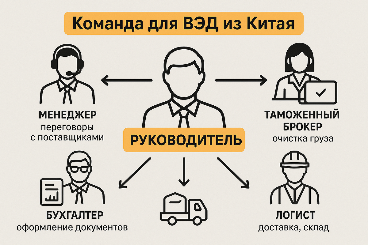 Для старта не нужно становиться таможенным гуру достаточно собрать команду из трех-четырех специалистов брокер, логист, бухгалтер по ВЭД и агент по оплатам.