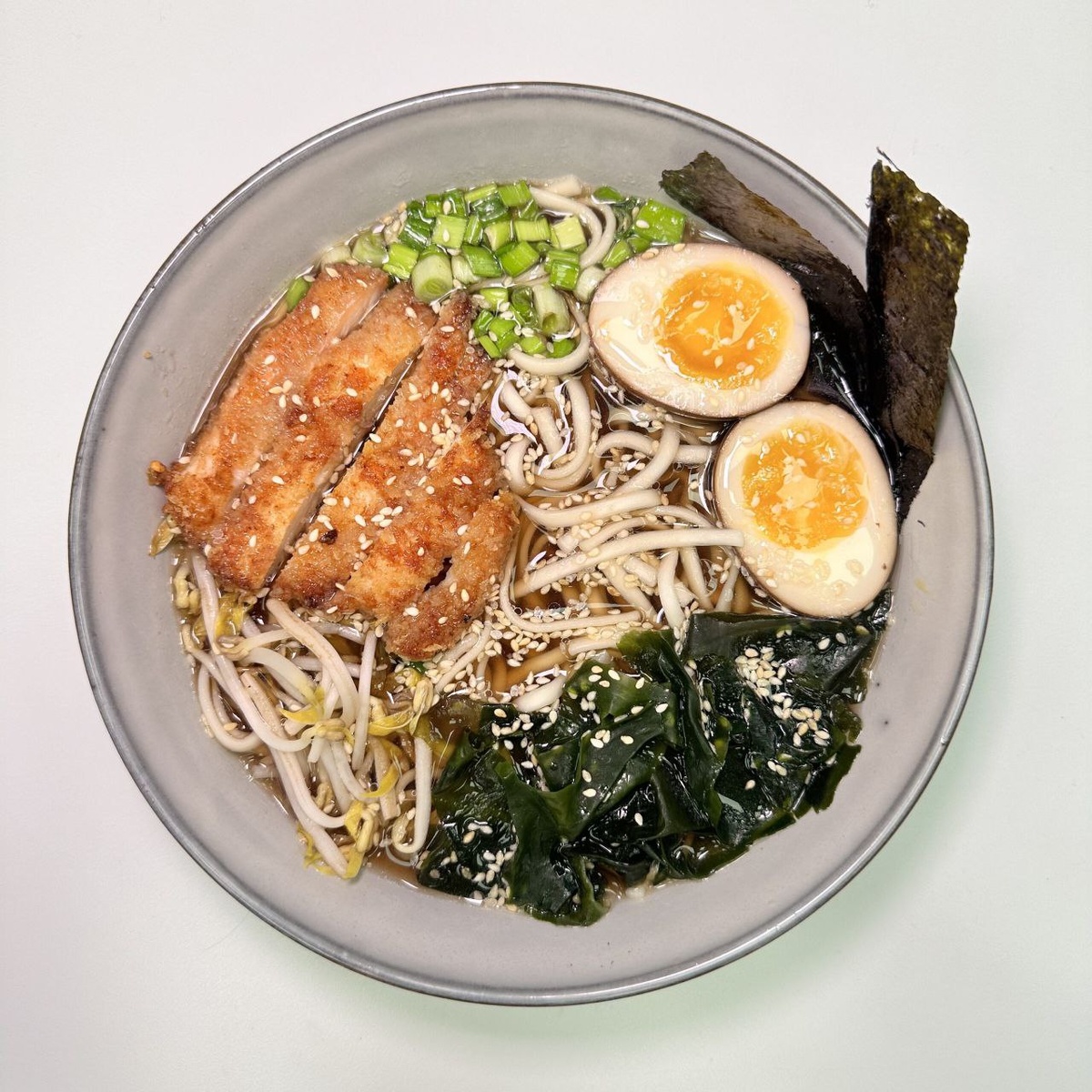 Ингредиенты: - Для бульона: - Куриная грудка или бедро — 2 шт. - Вода — около 2 л - Свежий имбирь — небольшой кусочек (~2 см) - Чеснок — 2 зубчика - Зеленый лук — пара стеблей - Соус соевый светлый — 2 ст.л. - Рыбный соус — 1 ч.л. - Кунжутное масло — 1 ч.л. - Перец черный молотый — щепотка - Даши-порошок (при желании добавить японский вкус) — по вкусу - Для лапши: - Лапша удон или соба (или специальная лапша для рамена) — примерно 200 г на порцию - Для куриного филе Кацу: - Филе куриное — 200 г - Яйцо — 1 шт. - Мука пшеничная — 3 ст.л. - Панировочные сухари (панко) — 80 г - Масло растительное для жарки - Дополнительно: - Вареные яйца (желательно маринованные в соевом соусе и сахаре) — 1 шт. - Морковь тонкими ломтиками - Шпинат свежий - Кресс-салат или любая зелень - Бамбуковые ростки (по желанию) - Тостированные семена кунжута — немного для посыпки сверху - Специи: соль, перец, чеснок по вкусу ⎯⎯⎯⎯⎯⎯⎯⎯⎯⎯ Как приготовить: 1. Подготовка бульона: 1. Зал