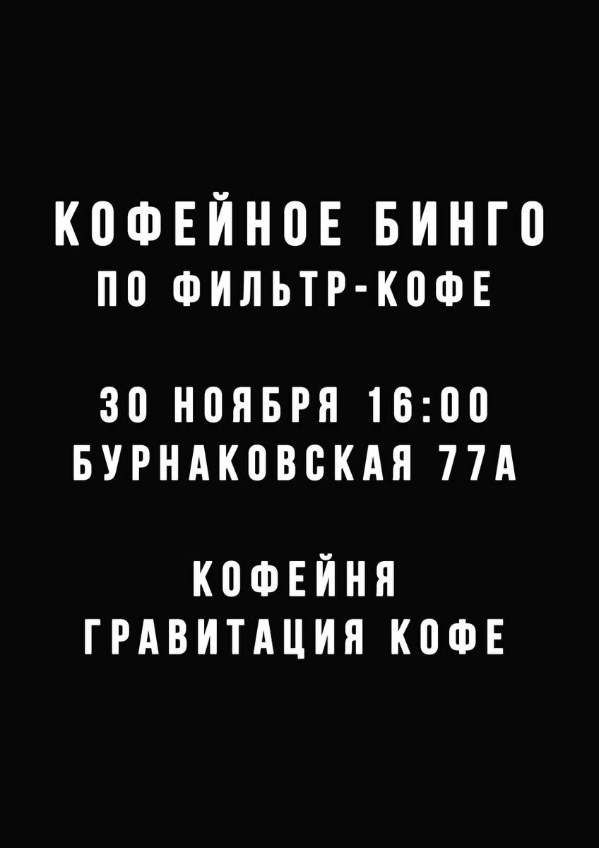 Кофейное бинго! Правила Варим 4 лота из разных стран с разнообразными обработками 85+ в кемексе (базовый рецепт) Этап 1 Каждый участник получает отдельный бланк Пробуем, по каждому лоту пытаемся угадать: 1. Страну 2. Обработку 3. Дескрипторы Этап 2 Вскрываем лоты, пытаемся их сопоставить с тем, что попробовали Этап 3 Пьем очень много фильтра, подсчитываем баллы и награждаем победителей Цена участия 490 рублей Награда за первое место сертификат на 100 рублей * число участников Награда за второе место сертификат на 70 рублей * число участников Награда за третье место сертификат на 30 рублей * число участников Проведение при 5+ участниках Запись в комментариях или в лс