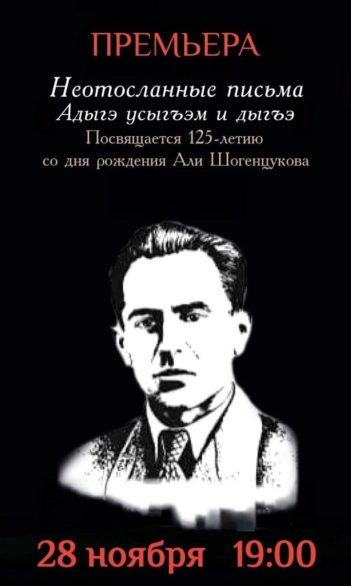📚Министерство культуры КБР сообщает, что 28 ноября в 18:00 часов на площади перед Кабардинским государственным драматическим театром им. А. Шогенцукова у памятника Али Шогенцукову состоится церемония возложения цветов, посвященная 84-й годовщине со дня смерти основоположника кабардинской литературы Али Асхадовича Шогенцукова, жизнь которого трагически оборвалась 29 ноября 1941 года. 🎭После церемонии возложения в 19.00 часов в Кабардинском государственном драматическом театре им. А. Шогенцукова состоится премьера спектакля «Неотосланные письма», основанного на реальных событиях из жизни Али Асхадовича Шогенцукова.