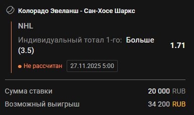 🏒🏒🏒🏒🏒 ⛰️Колорадо - 🦈Сан-Хосе Продолжаю заигрывать Колорадо пока команда в огне, 9 побед подряд и, кстати говоря, крайнее поражение "Лавинам" нанесли именно Сан-Хосе, да и не сказать что по игре. Сегодня жду уверенный реванш от хозяев, тем более на "Болл-Арене" (домашняя арена Колорадо) у "Акул" исторически не получается показывать результат, 13 поражений подряд. Прогноз: Индивидуальный тотал Колорадо больше 3,5