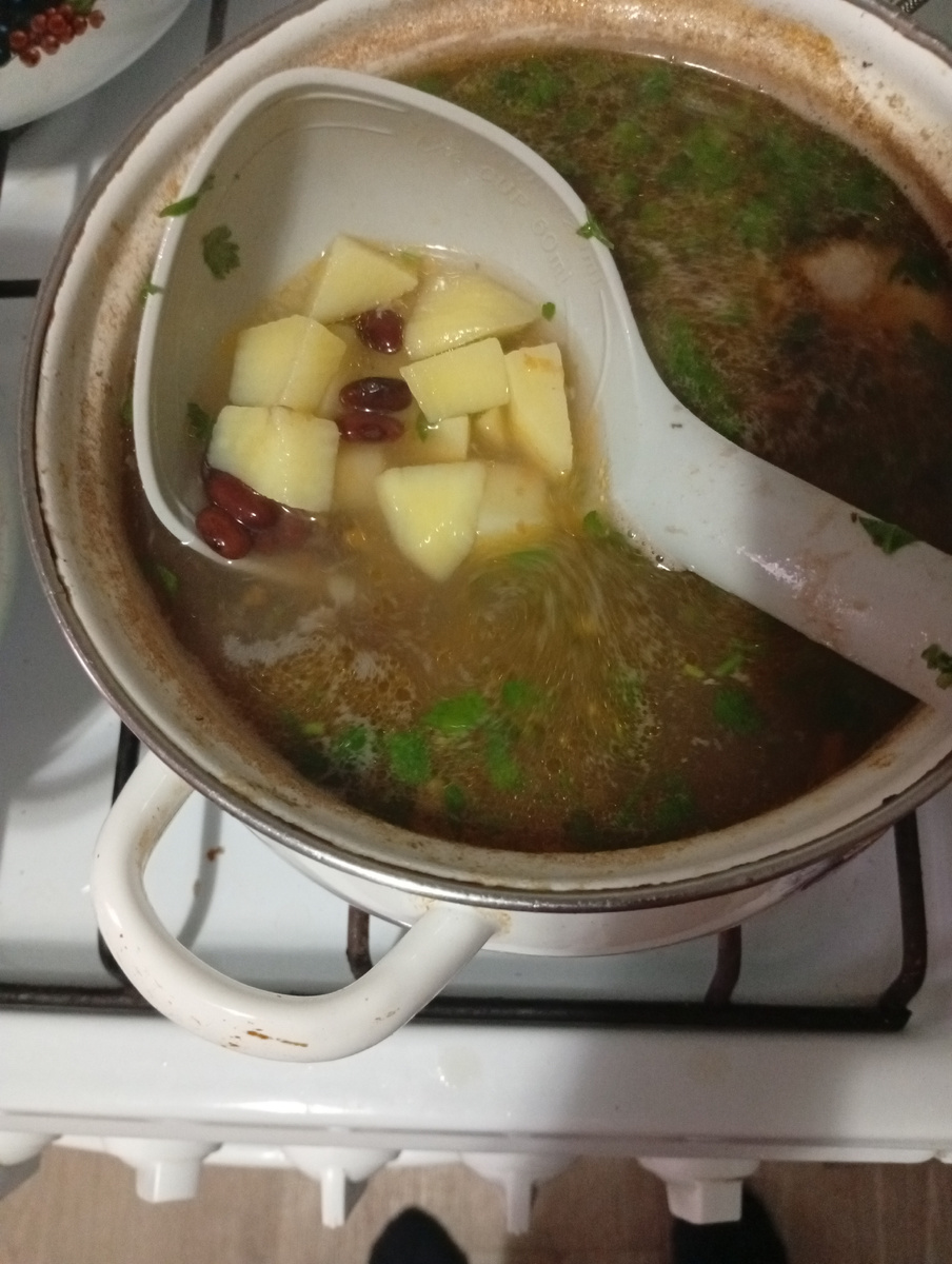 С бульона начнем варить суп.Мясо вымыть нарезать кусочки . Для бульона возьмем курицу , свинину приготовится быстро и бюджетно. 1. Проварим минут двадцать . За это время подготовим картофель , очистим и нарежем кусочками. Для "музыки" будет у вас фасоль Фасоль красная, она долго варится . Я предварительно отварила . Сначала фасоль надо замочить на несколько часов для набухания, я это делаю на ночь, а затем варить. В мультиварке за час фасоль готова Можно , конечно, взять и консервированную фасоль. В готовый бульон добавить картофель и фасоль, варим Приготовим поджарку : режим лук репчатый и трем морковь. На растительном масле и можно еще добавить сливочное масло обжарим . Зелень петрушки нарежим и добавим за пять минут до выключения вместе с поджаркой, ещё и специи на ваш вкус. Приятного хорошего дня всем.