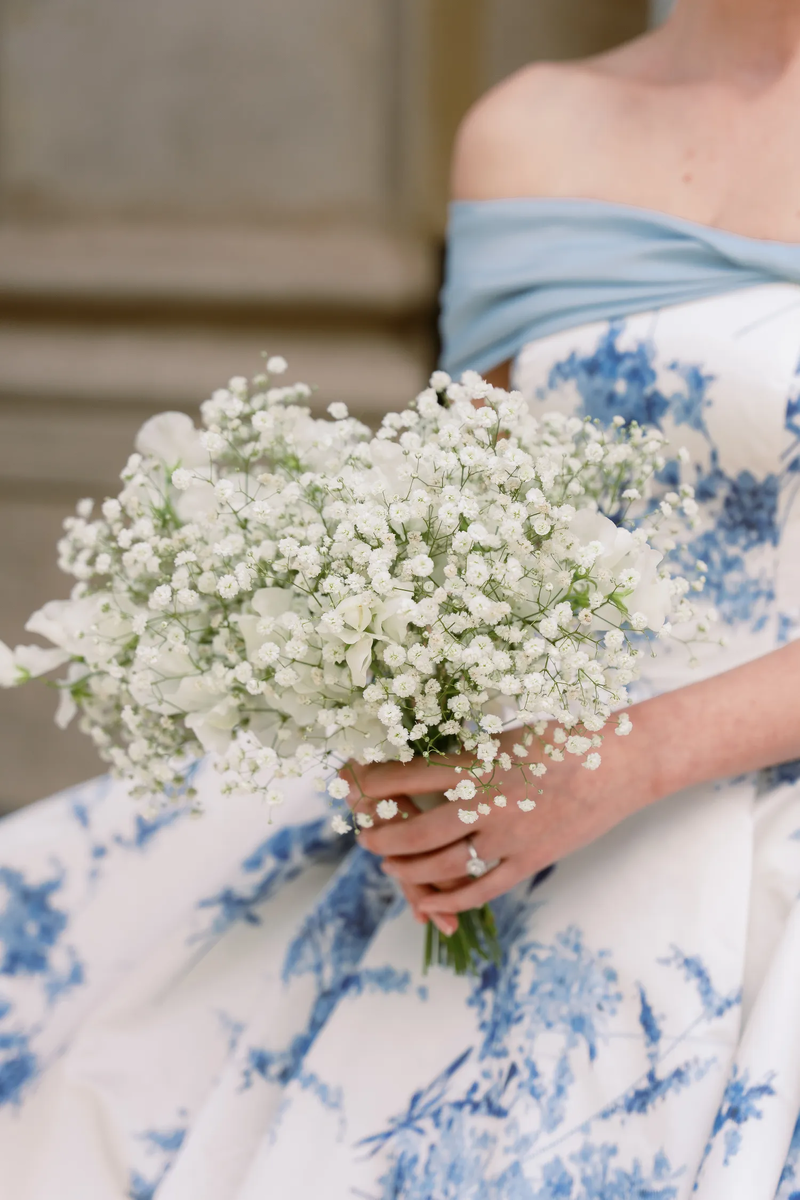 Вдохновлённые ярким свадебным платьем невесты, молодожёны выбрали цветовую палитру из оттенков синего, слоновой кости и зелёного, а также включили элементы шинуазри — от ваз до приставных столиков — во всё оформление торжества. Планирование свадьбы заняло меньше года, поэтому пара решила обратиться к профессионалам: они пригласили команду, чтобы воплотить их идеи в жизнь в празднике, который также почтил память матери невесты, умершей всего за шесть месяцев до свадьбы. «Так как я очень похожа на свою маму, было совершенно естественно и приятно, что её сущность стала вдохновляющим элементом нашей свадьбы», — поделилась невеста.