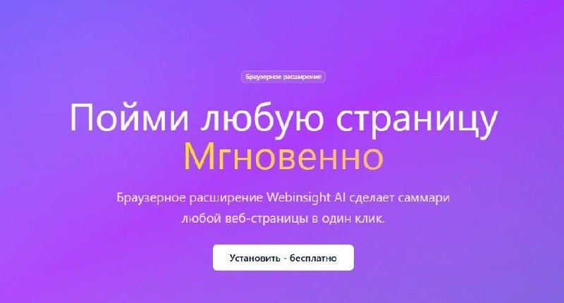Пойми любую страницу. Мгновенно. Ты — разработчик, аналитик, продакт? Погружаешься в тонны документации, статьей и писем от коллег? Хватит копировать текст, открывать чат-ботов и тратить энергию на беглый просмотр. Ты не должен "выискивать суть" — это работа для ИИ. WebInsight - твой ии-ассистент в браузере: - Делает выжимку из любого текста на странице — в один клик. - Краткое, среднее или подробное саммари — ты выбираешь. - Чат со страницей. Сфокусируйся на важном. Работай умнее, а не больше. Установи сейчас и работай меньше: Webinsight AI