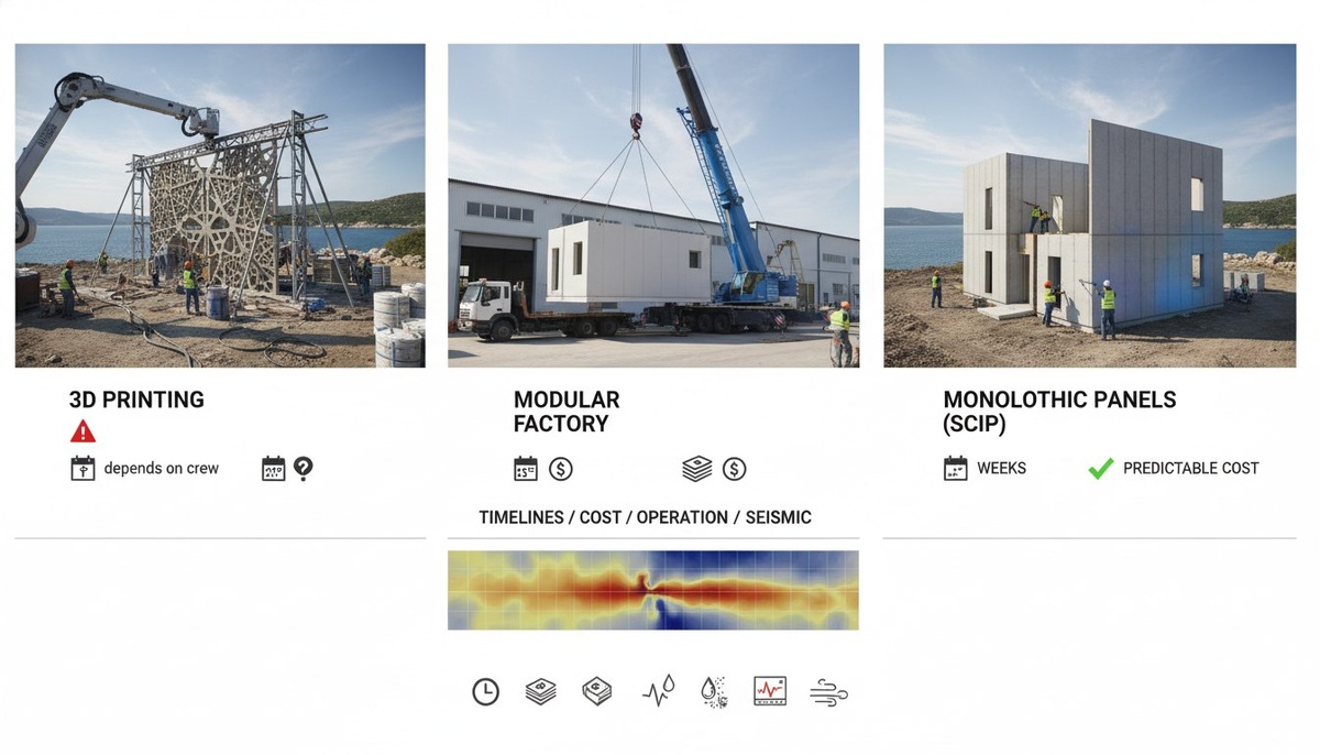 3D‑печать впечатляет — но платит кто‑то другой? Мы смотрим на цифры. К 2026 рынок полон хайпа: 3D‑печать, «заводские» модули, ЛСТК. Но для тех, кто строит не ради презентации, важны три фильтра — реальные сроки, итоговая стоимость «тёплой коробки» и эксплуатация в регионе. В Крыму добавляются сейсмика и прибрежный климат. Практика показывает: 3D и сложные каркасы редко дают массовую экономику — результат зависит от бригад. Мы в Box House видим, что монолитные панели по SCIP выигрывают по скорости (недели) и предсказуемости теплопотерь. Какой вариант вы бы выбрали для участка в Крыму? 🏠📊🔎