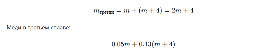 Первый сплав содержит 5% меди, второй — 13% меди. Масса второго сплава больше массы первого на 4 кг. Из этих двух сплавов получили третий сплав, содержащий 10% меди. Найдите массу третьего сплава. Обозначим: 1. Запишем содержание меди в сплавах: 2. Третий сплав — это просто соединение первых двух, его масса: 3. По условию, третий сплав содержит 10% меди, значит: 4. Решим уравнение: 5. Находим массу третьего сплава: Ответ: 16 кг. #огэматематика #огэ2025 #математикаогэ #подготовкакогэ #советыогэ #школа