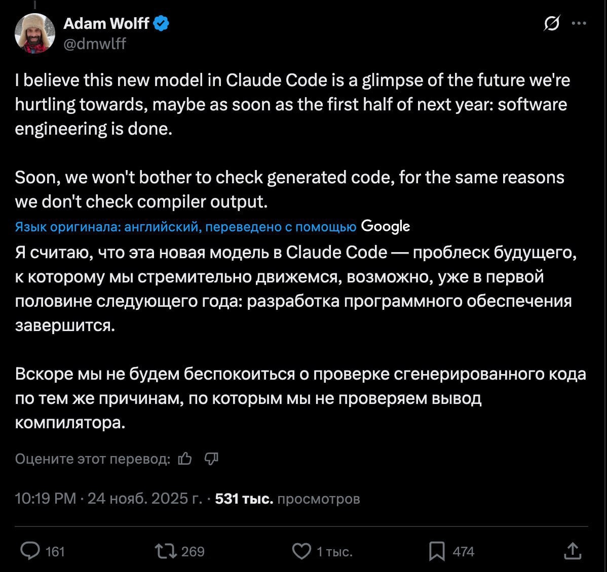 Адам Вольф, разработчик Claude Code из Anthropic, шутит: через полгода софтверным инженерам будет сложно «изображать бурную деятельность» 😏 По его словам, типичный рабочий день сегодня выглядит так: ставишь задачу Claude Code, идёшь за кофе на 20–30 минут — возвращаешься, а проблема уже решена. Остаётся лишь сделать серьёзное лицо и подправить пару строчек «для вида». Конечно, немного гиперболы — но практикующие инженеры подтверждают: ИИ реально ускоряет разработку и сильно помогает в рутине. Ампилов про ИТ: https://dzen.ru/id/623d938f380f3715018b6e3c