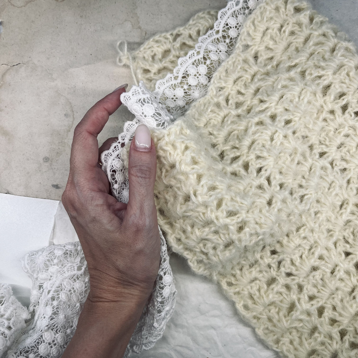 - Комбинирование ажурного вязаного узора с готовым кружевом