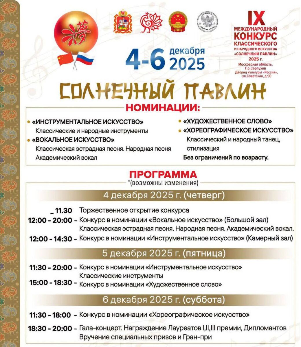 🦚 С 4 по 6 декабря 2024г. в Городском округе Серпухов состоится IV Международный конкурс классического и народного искусства «Солнечный павлин». На конкурсе будут представлены следующие номинации: * инструментальное искусство; * вокальное искусство; * художественное слово; * хореографическое искусство. ✔️ Конкурс проходит 9 лет и за это время стал визитной карточкой Серпухова. С каждым годом «Солнечный павлин» притягивает все больше участников с разных регионов России и зарубежья, активизирует творческую жизнь Южного Подмосковья, позволяет вывести на новую высоту уровень международного сотрудничества и взаимопонимания в сфере культуры. 🤝 Участники и зрители конкурса имеют возможность познакомиться с культурой других регионов и стран, укрепить традиционную дружбу между народами России, Китая и других регионов, погрузиться в волшебство музыки, прочувствовать глубину фольклорных песен, силу оперного искусства, художественного слова, грациозность народного и классического танца. ✅ Пр
