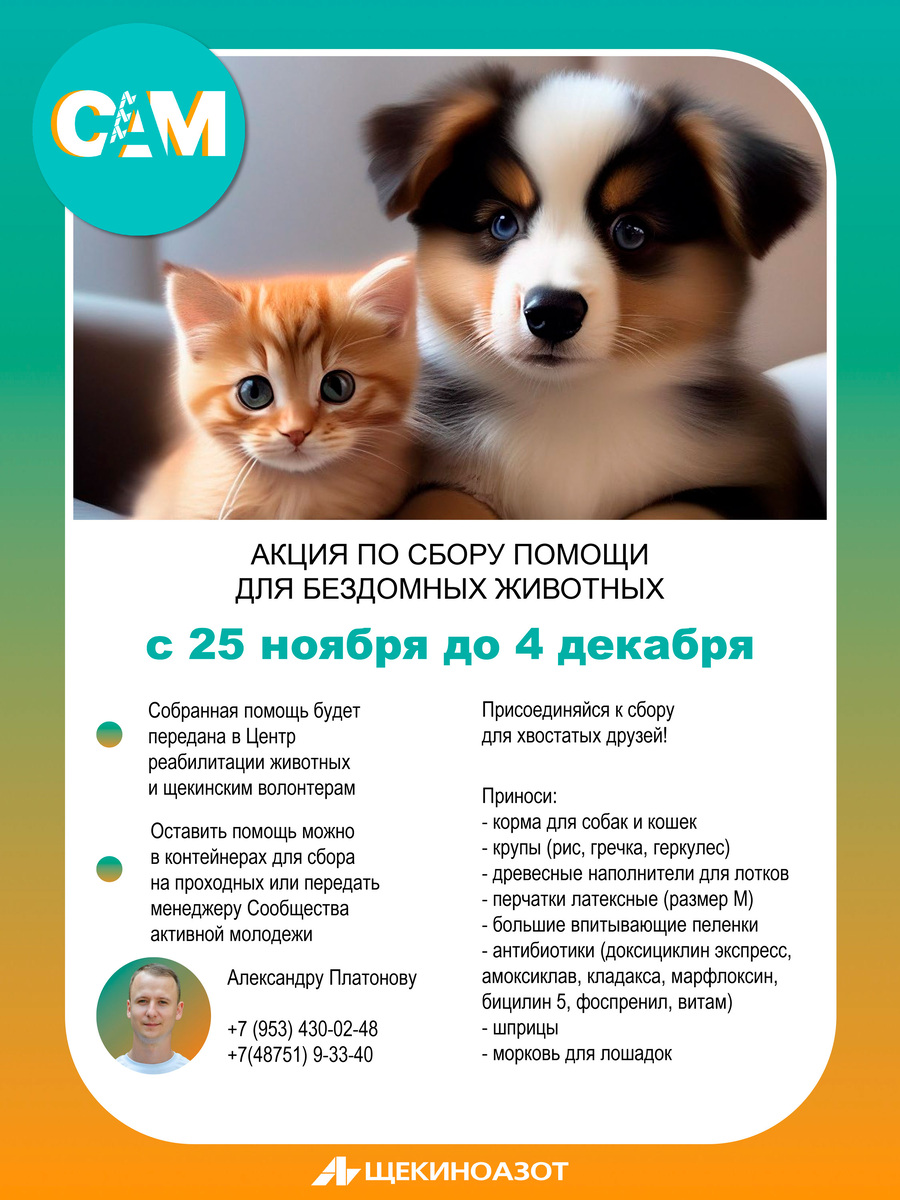 С 25 ноября по 4 декабря Сообщество активной молодежи проводит акцию по сбору помощи для бездомных животных. Инициатива такого формата организована не впервые: на протяжении нескольких лет неравнодушная молодежь и весь коллектив завода делают жизнь питомцев комфортнее и безопаснее. Даже небольшая помощь, объединенная усилиями многих людей, способна изменить чью‑то судьбу! Куда будет направлена собранная помощь?
