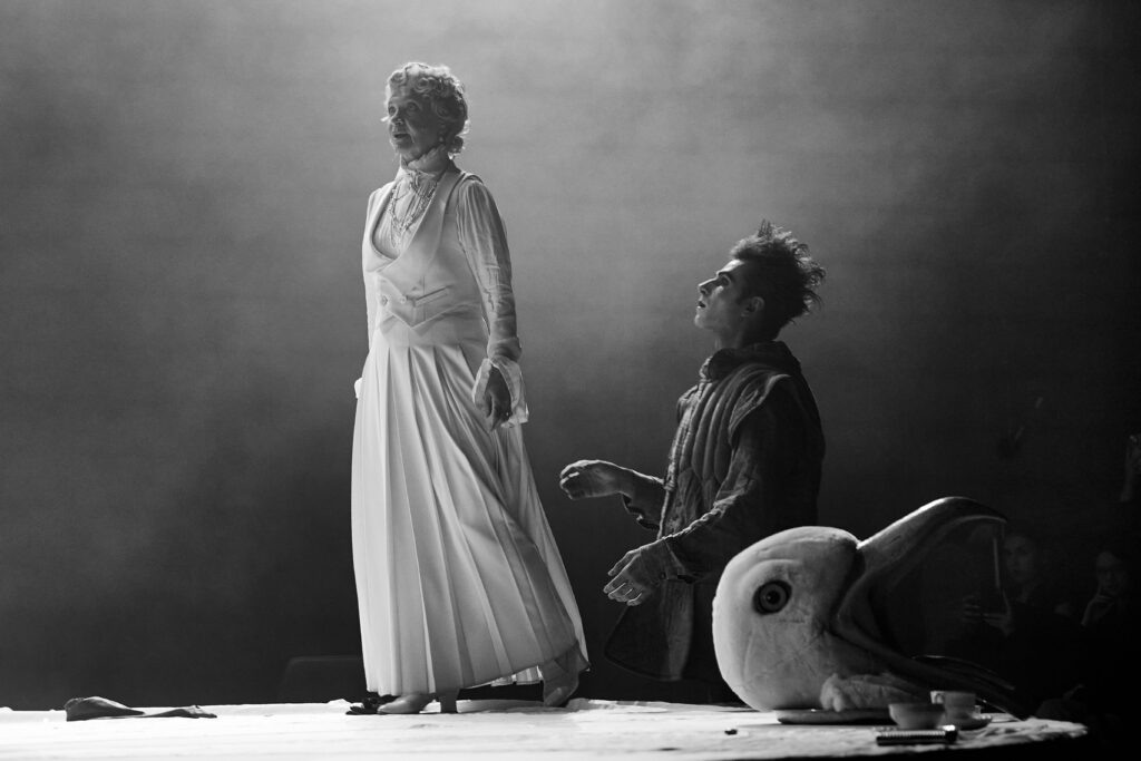По итогам «Кубани театральной-2025» «Пиковая дама» получила диплом «За создание концептуального образного мира», и с этой формулировкой трудно не согласиться. Спектакль — одна сплошная концепция и мистика. Новый театр кукол не впервые приглашает белорусского режиссера Александра Янушкевича, известного в первую очередь постановками для взрослых. Местный зритель знает его почерк по «Сказкам Гримм» и «Метаморфозам», где команда играет с условностями сценографии, нарушая шаблоны и ожидания аудитории. Одноименная опера, созданная П.И. Чайковским, ставшая вершиной творчества композитора, все же отличается от повести Александра Сергеевича: сюжет не изменен, но без пушкинских комментариев была утеряна метафизическая глубина произведения. В версии Янушкевича сохранен авторский замысел, а спектакль позиционирует себя как пластический. Сцена бала присутствует, но решена необычным образом и в соответствии с площадкой: куклы вальсируют словно в параллельном мире, находясь рядом с героями, но в маленьком пространстве, напоминающем коробочку. Какой месседж они несут? Зритель определяет сам. Публика получила психологический театр, где в основе повести лежит анекдот, а на сцене представлена двойственность человеческой природы, перевоплощающейся при помощи необычных элементов костюмов (художник — лауреат премии «Золотая маска» Татьяна Нерсисян). Красивые куклы элегантно интегрированы в общий контекст и подчеркивают разницу двух миров. В спектакль погружаешься плавно и медленно, словно надеваешь на себя хорошо скроенное пальто и после долго не хочешь расставаться с приятными ощущениями. Одна из самых стильных театральных работ Краснодара.