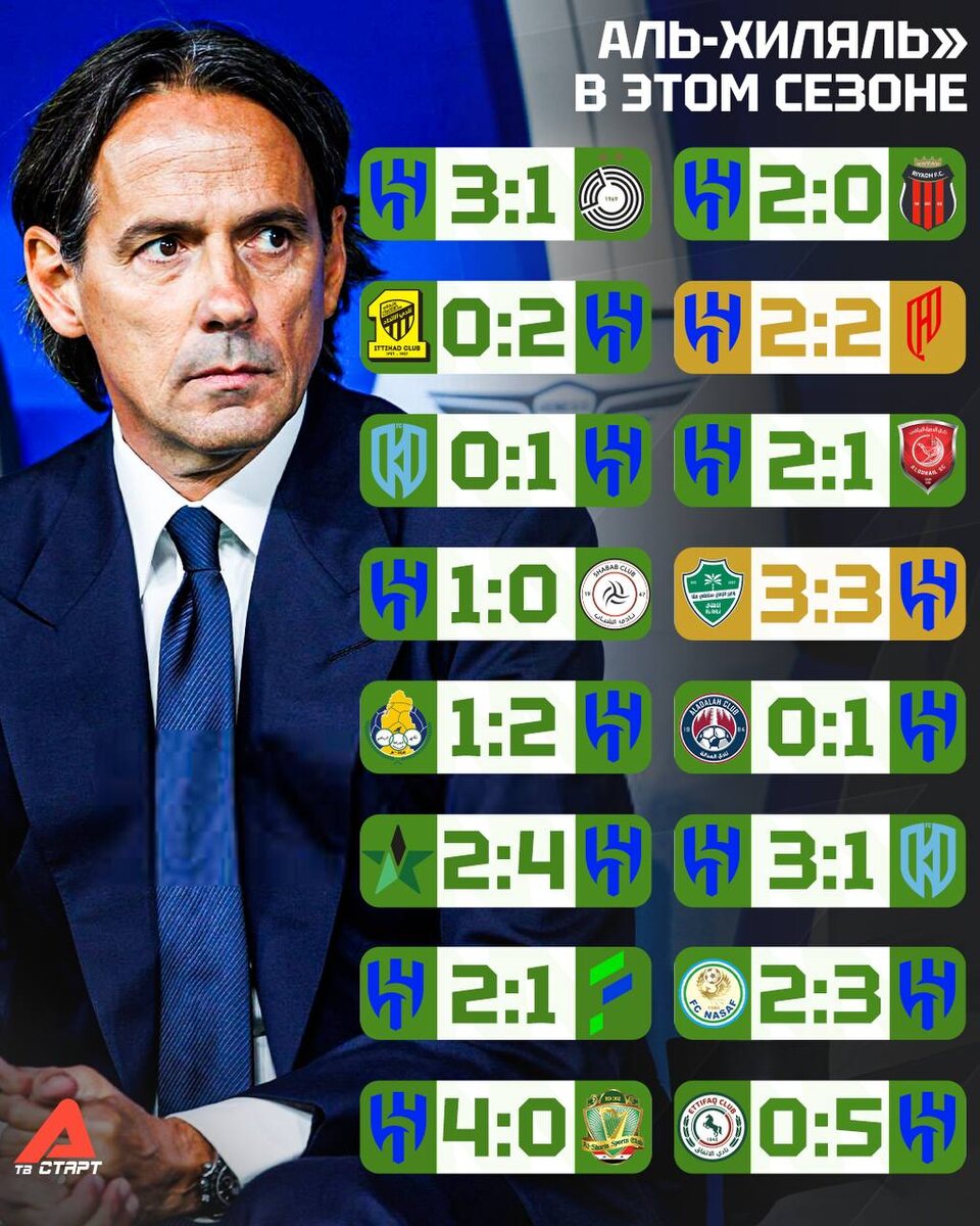 🤨👀Какой ещё «Интер»? Индзаги совсем забыл про миланский клуб и просто кайфует в Саудовской Аравии — помимо огромной зп ещё и выдает крутые результаты🇸🇦 14 побед в 16 матчах и ни одного поражения — это мощно🤯 Подписывайся на ТВ СТАРТ в MAX📲
