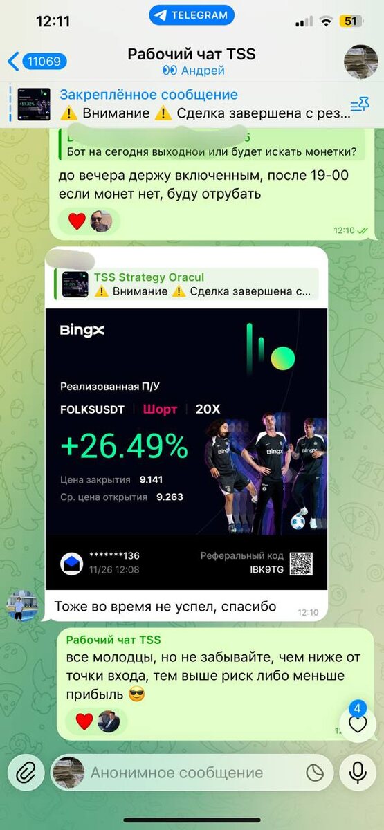 #результаты #tssoracul Сегодня все снова отлично поработали и провели удачную сделку по алгоритму TSS +51,32% Всех кто принял участие с профитом 😎✅✌🏼 Результаты прикрепляю😎 Бонусы от BingX 👈