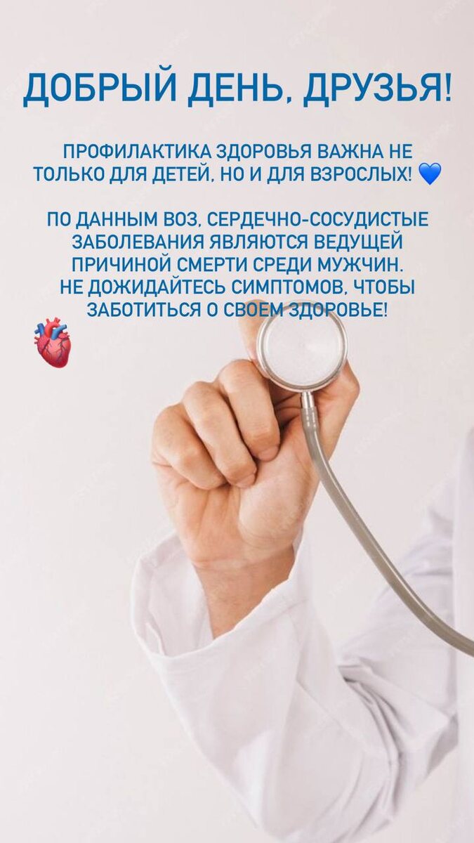 Добрый день, друзья! Профилактика здоровья важна не только для детей, но и для взрослых! 💙 По данным ВОЗ, сердечно-сосудистые заболевания являются ведущей причиной смерти среди мужчин. Не дожидайтесь симптомов, чтобы заботиться о своем здоровье!
