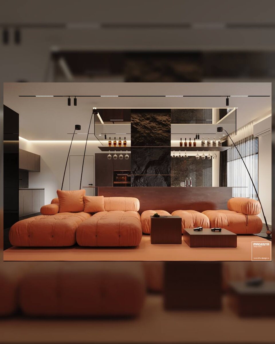 Когда стиль и функциональность говорят на одном языке Проект квартиры в ЖК «Полюса», застройщик «СК+» — идеальное сочетание динамичной энергии и эстетики премиального интерьера. В основе — смелое использование контрастных темных и насыщенных терракотовых оттенков, которые создают атмосферу уюта и драйва одновременно. Объемные модульные диваны приглашают к отдыху, а проработанные детали — от текстурных акцентов на стенах до эффектного освещения — делают пространство функциональным и комфортным. Прикоснитесь к дизайну класса А: портфолио реализованных проектов — на сайте magentastudio.ru Magenta