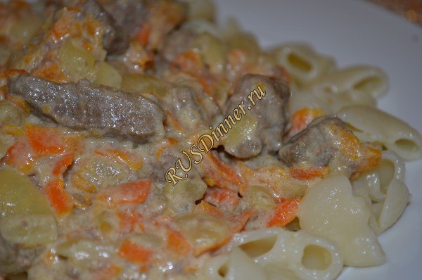 Печень тушеная в сметане Ингредиенты: Печень телячья - 700 гр. Молоко - 250 мл. Сметана - 300 мл. Морковь - 200 гр. Лук репчатый - 3 шт. Соль - 10 гр. (по вкусу) Перец черный молотый - 10 гр. (по вкусу) Масло растительное - 40 мл. (для поджарки) Источник: https://rusdinner.ru/page/pechen-tushenaja-v-smetane