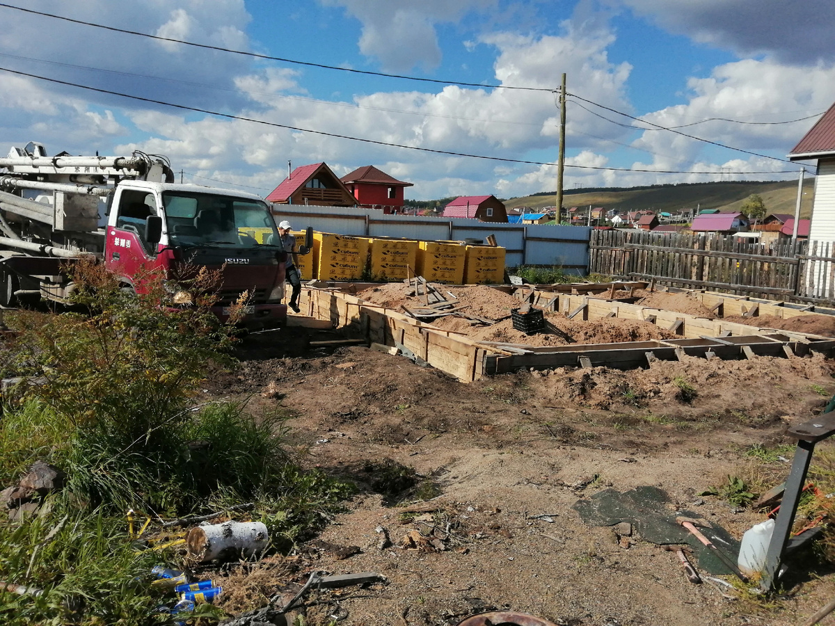 10 сентября 2022. Так как подьезд впритык был проблематичен,заливку фундамента делали бетононасосом.Марка бетона м300. Даже с бетононасосом было хлопотно,было не до сьемок.Есть только итоги после заливки. Гдето конечно и немного повело опалубку. Немного лишнего бетона вылил на мегаплощадку.... Разборка опалубки и промазывание мастикой,запах битума.... Тут подумал может был я не прав когда выгнал таджиков,да и время к зиме поджимало,позвал их опять.......зря...... Сложили они мне первый ряд бодренько.....и быстро,смотрю что то перестали работать и между собой что то разговаривают по своему,дальше не работают. Приезжает их главный,поговорил с ними и говорит мне-у вас немного перепад,надо блоки снести с одной стороны,подлить бетон и заново все.На мой вопрос а что сразу вы сами не подлили? Ответ меня озадачил-ну мы думали у вас ровный фундамент. На этом я с ними попрощался,мне стало понятно какие они строители. Дальше я решил сам все делать,кстати время уже к заморозкам подходило,положи