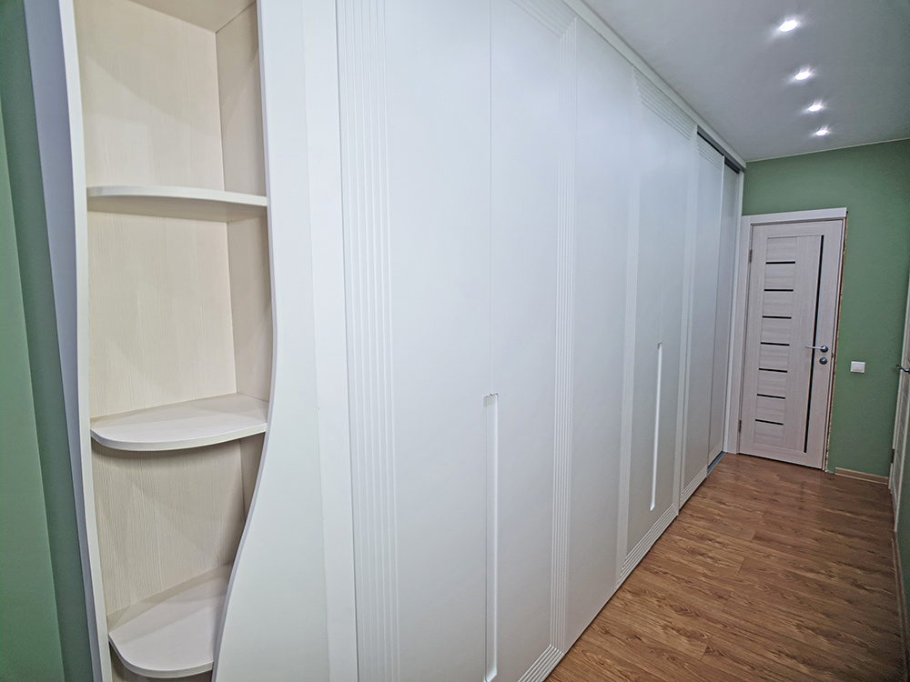 Мне колонка фигурная не понравилась. Я пытался мягко отговорить, но клиентка сказала - супер, мне очень нравится. Мне кажется эта колонка тут вообще не к чему. Потом. Мне конечно тоже не нравится соседство дверей-купе и распашных дверей. Клиентка не захотела полностью распашной шкаф делать, хотя я предлагал. Короче, кому интересно на сайте смотрите, потом я тут выложу видео - Шкаф в прихожую с МДФ.