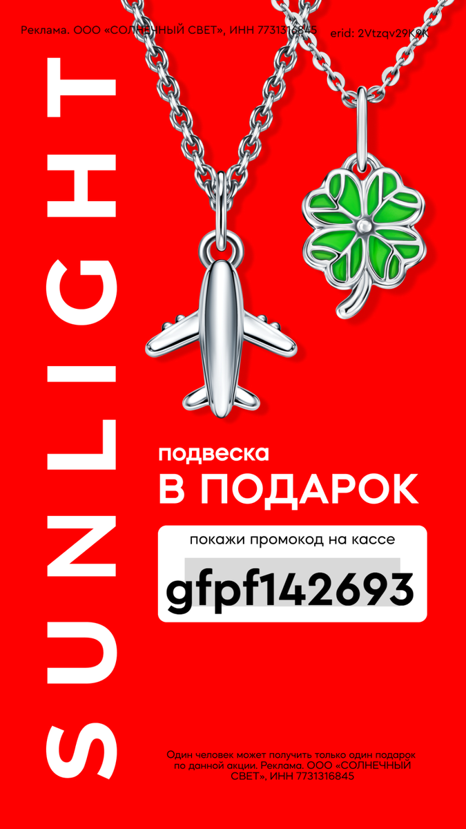 Только до 30 ноября! Уникальный подарок от SUNLIGHT 🗓️ Внимание, ловите момент! Ровно до 30 ноября в SUNLIGHT по промокоду gfpf142693 можно получить изящную подвеску совершенно бесплатно. Это не шутка! Такой шанс упускать нельзя. Это идеальный повод заглянуть в магазин за порцией позитива и маленьким блестящим счастьем. Мой совет — скриньте прямо сейчас и бегите в SUNLIGHT! Потом будете жалеть, что не успели. https://sunlight.prfl.me/candies92/ianj9u?erid=2Vtzqv29K9K