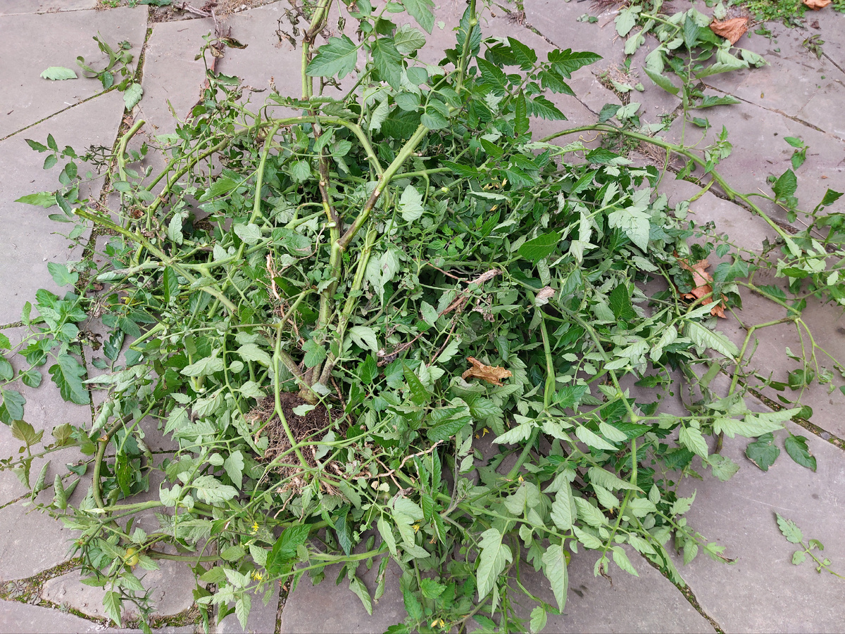 Неделю назад убрали два последних куста помидора сорта Де Барао черный, который обогнал по росту плетей виноград. Вот она, радость куриная, лежит.