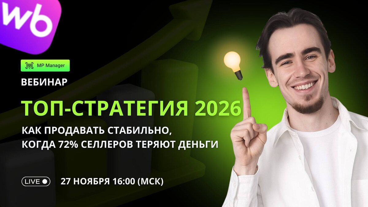 🔥 Топ-стратегия 2026: как продавать на WB стабильно, когда 72% селлеров теряют деньги Бесплатный вебинар – 27 ноября, 16:00 2024–2025 стали самыми турбулентными годами на Wildberries: 📉 рост ставок до +40% 📉 органика занимает до 70% выдачи 📉 у 72% селлеров падает прибыль Но 9 из 10 наших клиентов продолжают расти – потому что работают по системе, а не хаотично. На вебинаре мы разберём стратегию, которая будет топовой в 2026 году. 💚 Что вы узнаете за 60 минут: 1️⃣ Диагностика кабинета за 5 минут – как определить товары, которые приносят 80% прибыли – как выявить позиции, которые «съедают» до 40% бюджета – как избавиться от неликвида без просадок 2️⃣ Почему выигрывают не те, кто платит больше Органика = до 70% продаж. Мы разберём, как попасть в топ без переплат за рекламу, используя скрытые факторы ранжирования. 3️⃣ Как поднять CTR на +20–60% – A/B-тесты: тестируем не только обложку, но всю инфографику – AI-генерации фото за 1 минуту – отзывы, которые увеличивают конверсию