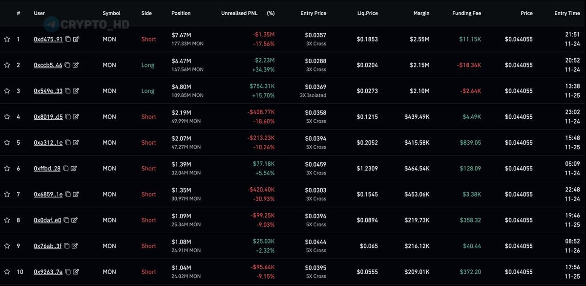 π ΠΠΎΡΡΠΈ Π²ΡΠ΅ ΠΈΠ· Π’ΠΠ-10 ΡΡΠ΅ΠΉΠ΄Π΅ΡΠΎΠ² ΠΏΠΎ ΡΠΎΠΊΠ΅Π½Ρ #MON Π½Π° Hyperliquid ΡΠ΅ΠΉΡΠ°Ρ Π΄Π΅ΡΠΆΠ°Ρ SHORT-ΠΏΠΎΠ·ΠΈΡΠΈΠΈ (ΡΠΏΠΈΡΠΎΠΊ