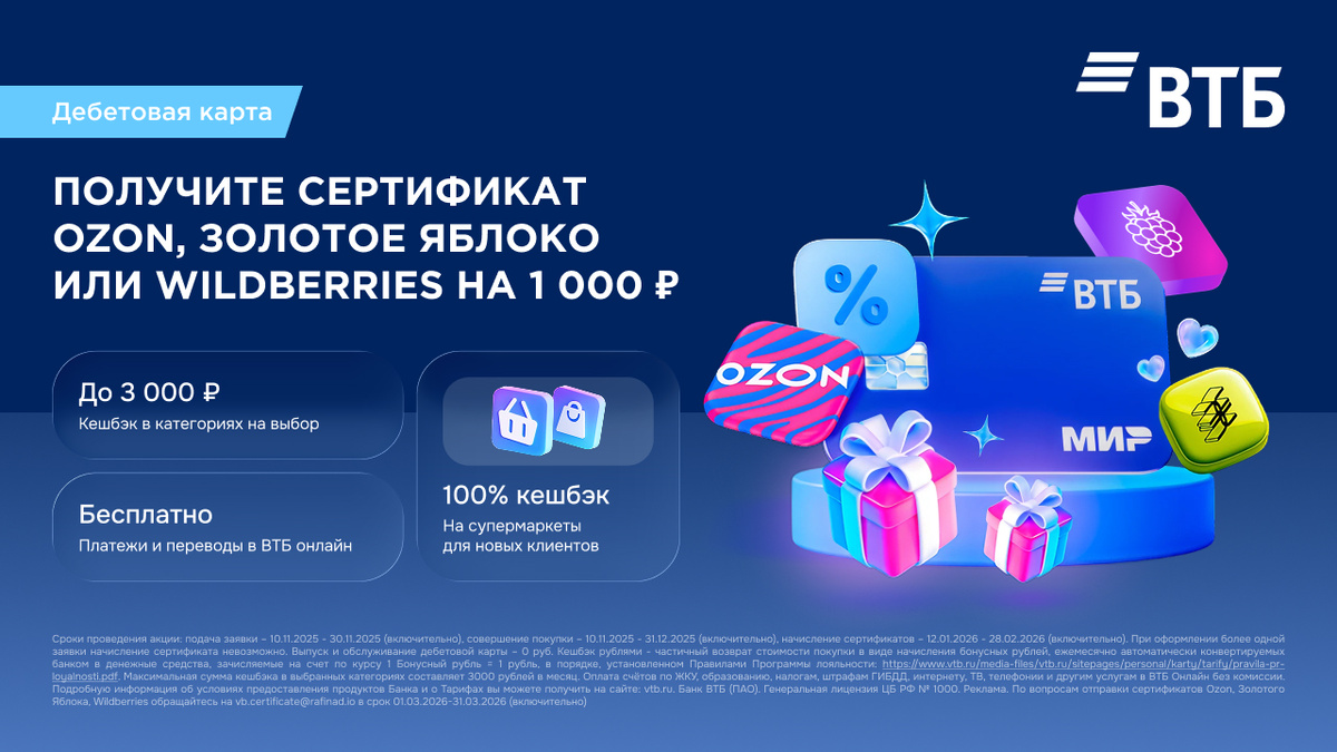 Сертификат на 1000₽ + до 3 000₽ кешбэка за покупки от ВТБ.