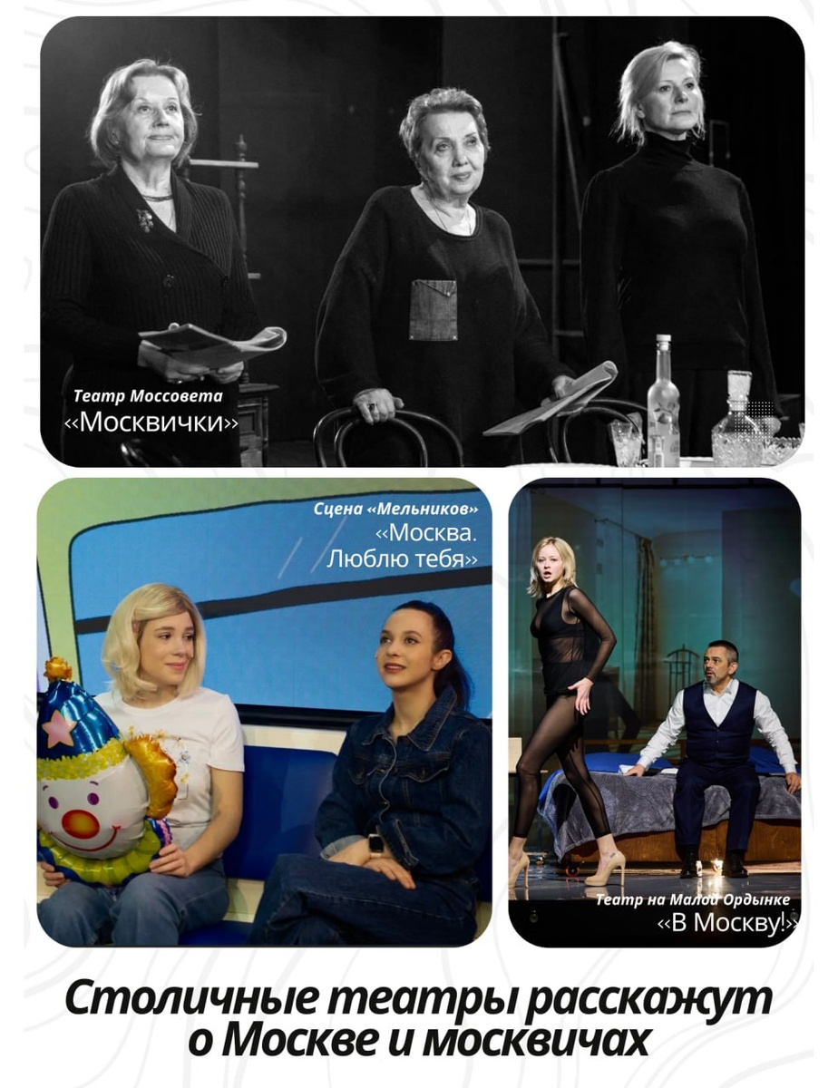 Столичные театры расскажут о Москве и москвичах 🏰 «Москва и москвичи» — так назывался драматургический конкурс, который проходил в 2024 году. Его инициатором выступил Театр Моссовета, идею поддержал Департамент культуры Москвы, жюри возглавил Андрей Кончаловский; вместе с ним тексты оценивали Владимир Машков, Константин Богомолов, Евгений Герасимов, Евгений Марчелли, Григорий Заславский, Алексей Варламов, Ольга Остроумова и Елена Исаева. Итоги конкурса были подведены год назад. Три пьесы были объявлены победителями; теперь настало время увидеть спектакли по ним. 1️⃣Один из спектаклей, возникших по итогам конкурса, так и называется — «В Москву!» В самом конкурсе сочинение Ольги Антоновой участвовало под другим заглавием («Ну как там, в Москве?»), однако в ходе репетиций в Театре на Малой Ордынке было принято решение обратиться к чеховской цитате, давно ставшей «позывным» для всех провинциалов, покоряющих столицу (о них, собственно, и пьеса). Премьера этой постановки состоялась 31 ок