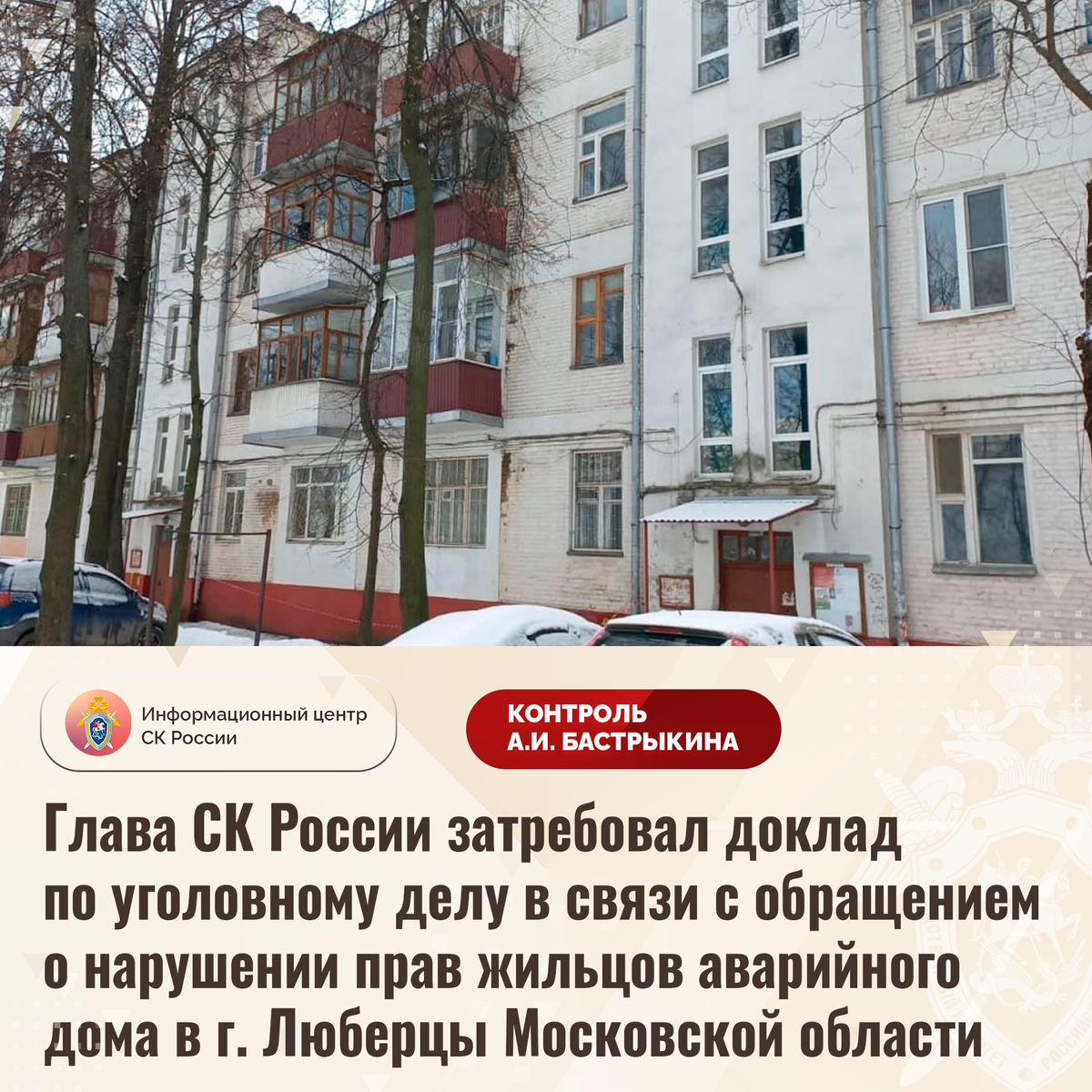 Глава СК России затребовал доклад по уголовному делу в связи с обращением о нарушении прав жильцов аварийного дома в г. Люберцы Московской области В приемную Председателя СК России А.И. Бастрыкина «ВКонтакте» поступило обращение по вопросу длительного нерасселения жильцов многоквартирного дома в поселке Калинина города Люберцы Московской области. В связи с высокой степенью физического износа конструкций по решению суда в 2022 году здание 1926 года постройки признано аварийным. Однако до настоящего времени благоустроенное жилье собственникам не предоставлено, установленный на прошлый год срок расселения перенесен. Многочисленные обращения граждан, вынужденных проживать в небезопасных условиях, в различные инстанции результатов не принесли. Указанная ситуация освещалась в СМИ и социальной сети. В ГСУ СК России по Московской области возбуждено уголовное дело. Председатель Следственного комитета Российской Федерации Александр Иванович Бастрыкин затребовал у руководителя ГСУ СК России по М