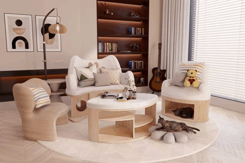 На фото - комплект мебели для животных, кормушки, игрушки, урна для утилизации фекалий от животных