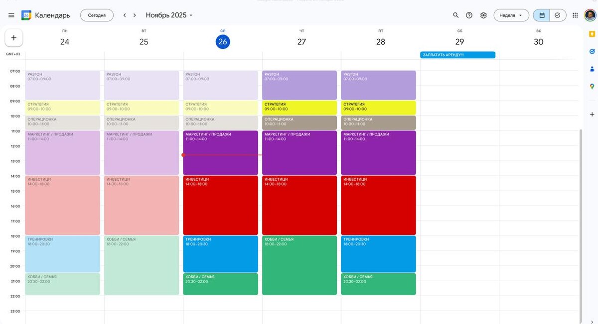 На чем держишь фокус своего внимания на системной основе - на то по сути и влияешь в своей жизни. Уже месяца полтора ходил с идеей, как сформировать свой распорядок рабочей недели, чтобы держать фокус и системно развивать определённые сферы моей жизни - профессиональную и личную. Вот что в итоге получилось (на скрине). Из скрина кстати можете обратить внимание, на что в большей степени у меня сейчас основной фокус моего внимания и усилий.