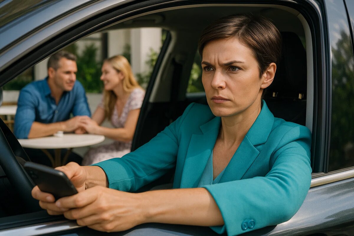 Виктория притормозила перед светофором и увидела его сразу. Кирилл сидел на открытой террасе пекарни с женщиной в светлом платье. Та самая флористка, которая всегда улыбалась им обоим. Сейчас она смеялась, откинув голову, и её рука легко касалась его запястья.