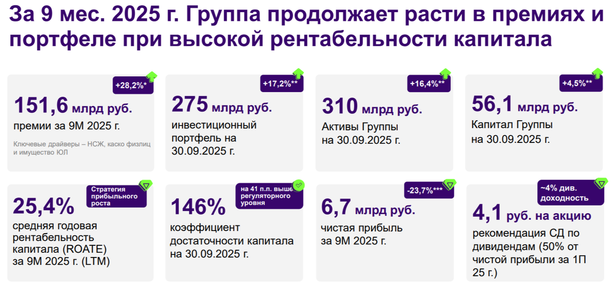 📞 Чистая прибыль: 6,7₽ млрд (-23,7% г/г) 🟣 Компания имеет 2 основных вида страхования, премии: life — 95,3₽ млрд (+50,9% г/г, продажи НСЖ взлетели из-за расширения территории, плюс по нему можно взять налоговый вычет), non-life — 56,2₽ млрд (+2,2%