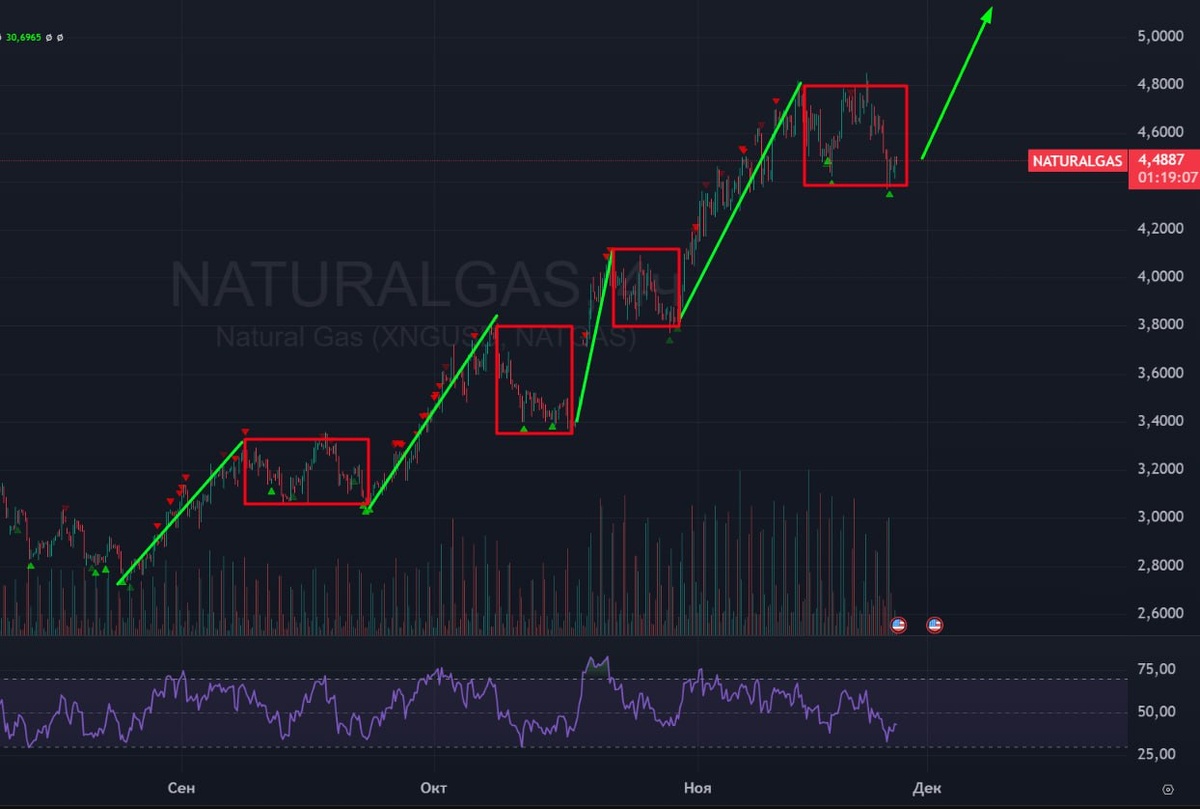 ⛽️ ГАЗ 🟢Еще в июле я рисовал таргет по газу на 5$ или 8$ до ноября, но движение началось в августе, что на протяжении летнего месяца вызывало волну хейта. Почти приехали к цели в пять баксов. Тренд тут довольно сильный, с небольшими откатами. Предполагаю, что газ продолжит движение вверх до середины декабря, после чего жду окончание восходящего тренда. #Газ #NG #американскийгаз #Фьючерсгаза #naturalgas #bogdanoffinvest