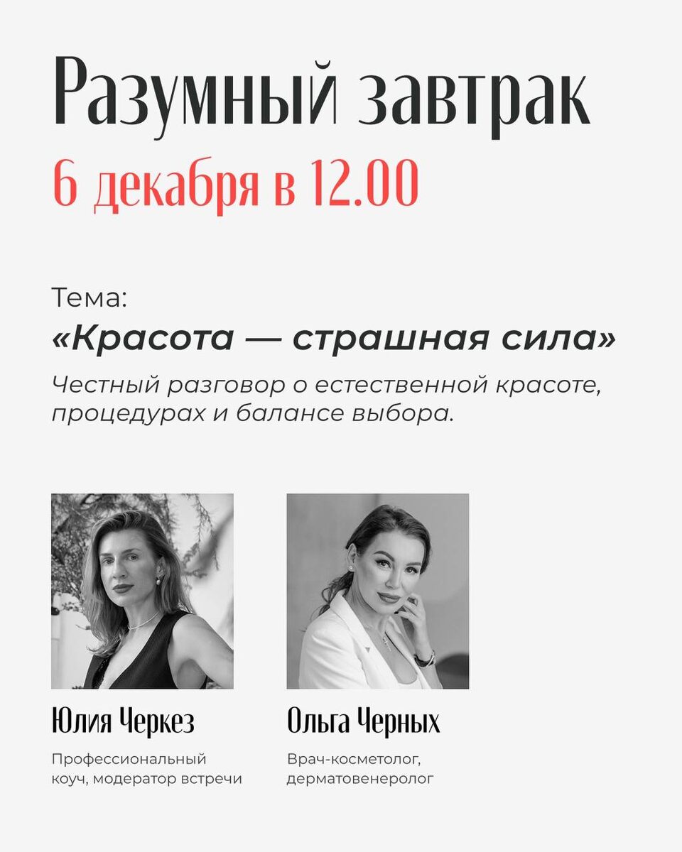 «Красота — страшная сила» На Разумном завтраке в субботу 6 декабря состоится честный разговор о естественной красоте, процедурах и балансе выбора. Гость встречи — Ольга Черных, врач-косметолог, дерматовенеролог, эксперт с глубоким пониманием анатомии лица, безопасности и современных методик. 🤍 Тема завтрака: «Красота - страшная сила». Обсудим: — где проходит граница между естественностью и корректировкой? — какие процедуры действительно работают, а какие — просто маркетинг? — как меняется отношение к внешности после 30/35/40? — что влияет на «здоровый» образ лица? — и как не потерять себя в бесконечной гонке «быть лучше»? Будет честно, полезно и без иллюзий 🤍 🌟🌟🌟🌟🌟🌟🌟🌟🌟 ❤️Когда: 6 декабря, суббота с 12.00 до 15.00 ❤️Где: ресторан Signature Art, Котельническая набережная, 1/15 ❤️Условия: орг.взнос 3500 + еда/ напитки по счету ▪️ Стать гостем можно через личное сообщение. До встречи уже совсем скоро 🤍 ❤️ ТГ-канал Ольги для знакомства! #анонс #мероприятия #красота